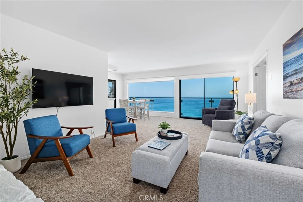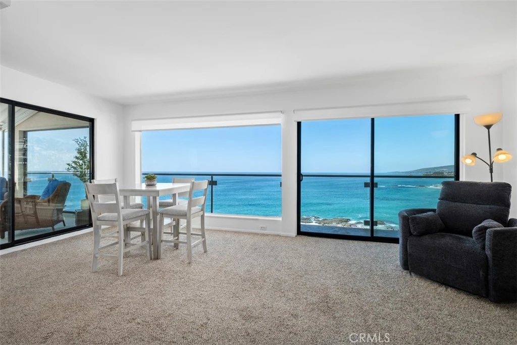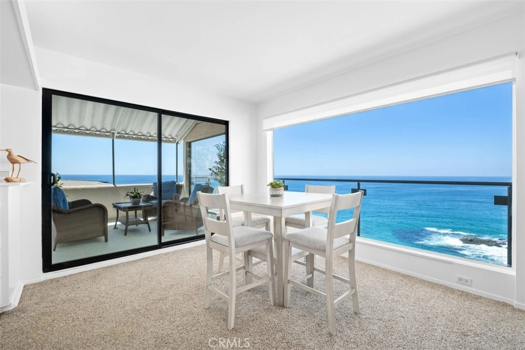 Spectacular Oceanfront Penthouse with Panoramic White-Water Views in Laguna Beach. Perched atop Table Rock, this rarely available, fully furnished 2-bedroom, 2-bath oceanfront penthouse delivers some of the most dramatic and sweeping coastal views in all of Laguna Beach. Floor-to-ceiling glass walls frame breathtaking white-water vistas, expansive coastline and unforgettable year-round sunsets over Catalina Island. Designed for effortless indoor-outdoor living, the open-concept floor plan flows seamlessly to the largest covered deck in the complex, perfect for morning coffee, al fresco dining or simply soaking in the ever-changing ocean scenery. Every room in this beautifully maintained home captures its own stunning ocean view, while updated appliances blend seamlessly with the original architectural charm. Enjoy resort-style amenities including a pool and spa, oceanfront BBQ area, private community stairs to the beach, billiards room, library, gym and clubhouse. Walk to restaurants, shopping, art galleries and entertainment. Experience the ultimate Laguna Beach lifestyle in this private, view-filled retreat.