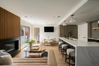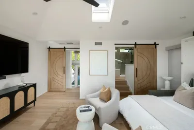 Tucked away on a quiet cul-de-sac just steps from the beach, this beautifully updated home offers the ideal blend of privacy, coastal living, ocean views, and modern design in the heart of South Laguna. The home is thoughtfully designed across multiple levels, emphasizing maximized space, natural light, and functionality. High ceilings, expansive windows, and thoughtful details, such as barn doors and custom built-ins, create a bright, airy feel that lives larger than its footprint. Tall windows and sliding glass doors surround the main living area, creating an inviting atmosphere with a seamless connection to the beautifully landscaped outdoors. A sleek, updated kitchen features a quartz peninsula, high-end appliances, custom cabinetry, and refined finishes, flowing into the living space complete with a statement fireplace, surround sound, Lutron lighting, and motorized blinds. Just off the kitchen, a dedicated laundry and storage room adds everyday convenience. The lower level includes a spacious private guest bedroom with tall glass sliders and windows. The primary suite occupies its own level, offering soaring ceilings, abundant natural light, a beautifully remodeled bath, and stunning ocean views. Perched just above this level, the expansive rooftop deck captures an awe-inspiring panoramic ocean view. This creates the perfect space for entertaining, featuring a built-in weatherproof TV, refrigerator, and retractable awning for year-round comfort and privacy. Additional property highlights include an outdoor shower, central A/C, recessed lighting, a spacious one-car garage with EV charging, and driveway parking. A smart home camera system provides exterior coverage, motion alerts, and real-time access from your phone. Located just moments from world-class beaches, snorkeling, hiking and biking trails, renowned restaurants, top-rated schools and luxury resorts, this home offers the very best of the Laguna Beach lifestyle.