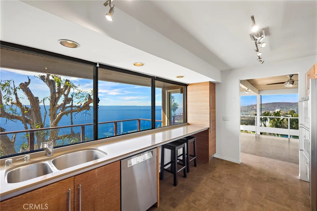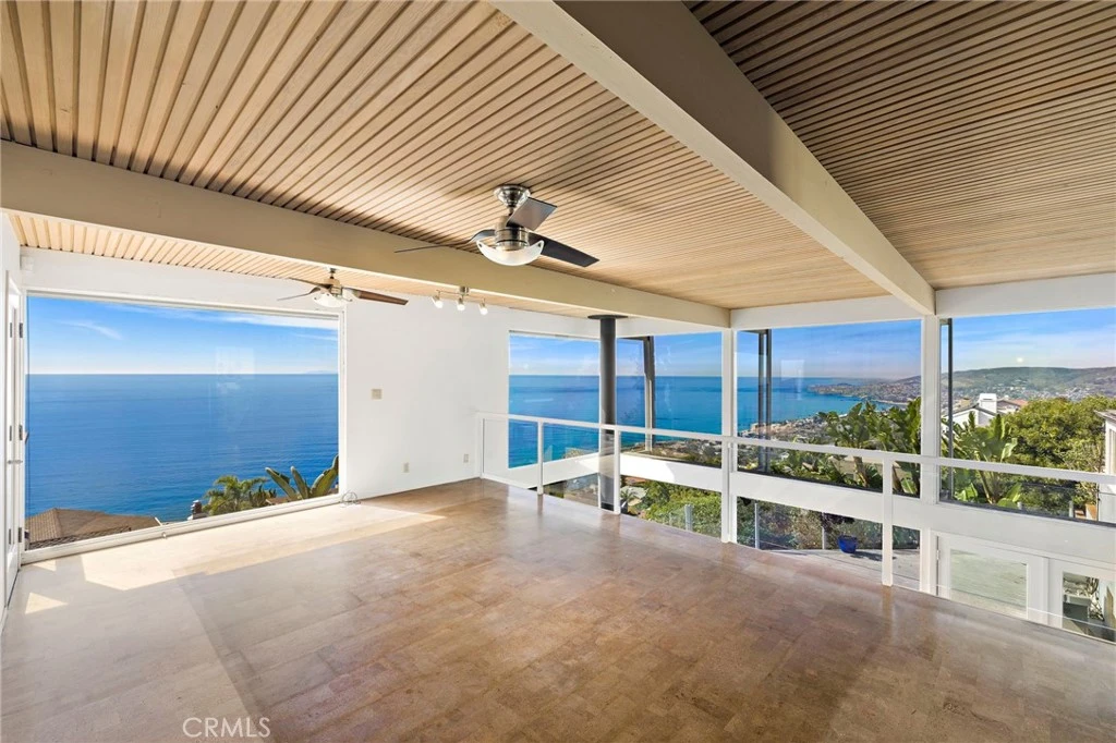 Awe inspiring views await at 599 Alta Vista Way. A striking, a mid century architectural home in coastal Laguna Beach. Perched on a corner lot overlooking the blue Pacific with exceptional coastline vistas and sunsets. Unassuming and private from the street side elevation, the entry to interior presents a floating staircase and glass pendant period lighting. The lower living room has floor to ceiling windows, open high ceiling spanning 2 levels, wood detailed walls, vintage gas fireplace and Andersen French doors to deck. The expansive deck is perfect for entertaining with glass partitions allowing sit down views and dedicated gas connection with barbecue included. The primary suite is on this lower level also featuring an ocean view, rear deck access, walk-in closet and dual vanity stone surface bathroom featuring separate tub, walk-in shower. Upstairs the open living/dining space features beamed ceilings, walls of glass and door to upper view deck. The custom kitchen has stone countertops, wood cabinetry, stainless steel appliances of gas cooktop, oven, dishwasher, microwave and refrigerator/freezer. The double sink and adjacent bar seating enjoy marvelous view points of the ocean and Catalina Island. Additional amenities include central heat and air conditioning, tankless water heater, dedicated laundry room and two car garage storage.