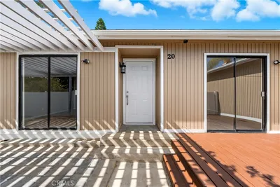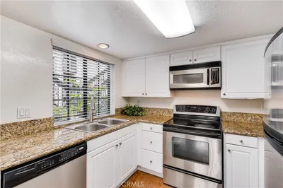 Welcome to 22126 Caminito Vino, a beautifully upgraded upper-level end unit nestled in the highly sought after Laguna Village community of Laguna Hills. This light-filled residence offers privacy, comfort, and stylish living with serene greenbelt views. Step inside to discover an open and inviting floor plan featuring wide-plank laminate wood flooring, recessed lighting, and a cozy fireplace that anchors the spacious living room. The kitchen is thoughtfully designed with crisp white cabinetry, granite countertops, stainless steel appliances, and modern fixtures situated for everyday living and entertaining. The adjacent dining area flows seamlessly into the living space, creating an ideal layout for gatherings. The generously sized primary bedroom offers a peaceful retreat with direct access to a private patio overlooking lush landscaping. A versatile second bedroom functions beautifully as a guest room, home office, or den. Freshly painted throughout. Additional highlights include an interior laundry area with side-by-side washer and dryer, newer doors throughout, and two detached single-car garages located conveniently below the unit, along with abundant guest parking. Residents of Laguna Village enjoy resort-style amenities including pools, spas, tennis courts, basketball courts, and a clubhouse—all set within beautifully maintained grounds. Turnkey and move in ready, this home combines comfort, convenience, and community living in one exceptional offering.