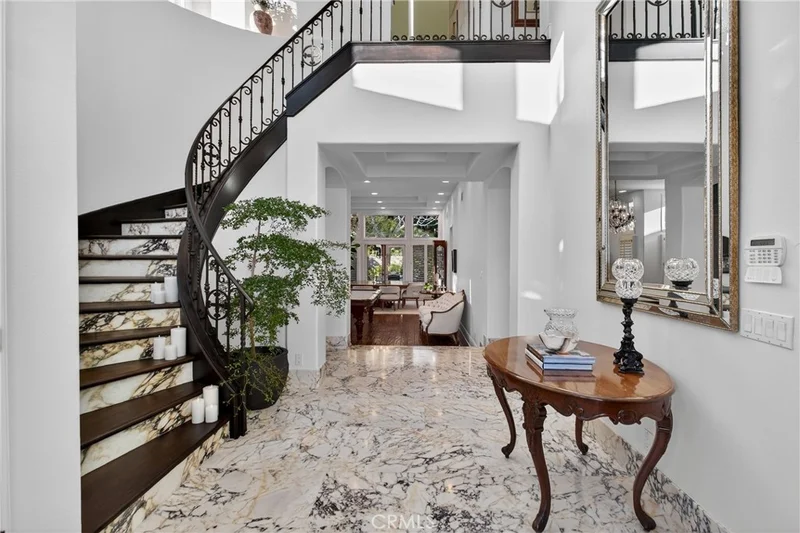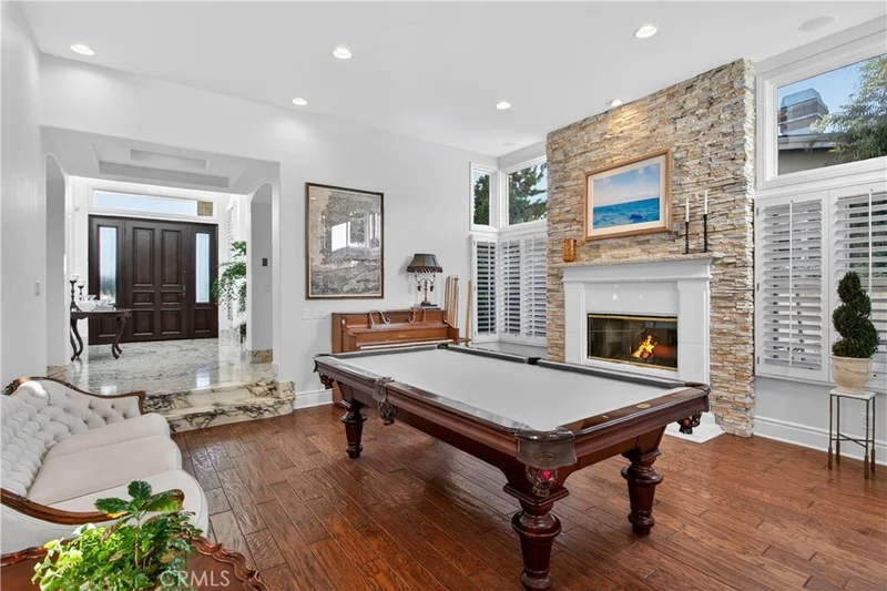 Tremendous opportunity to own one of the best homes to ever hit the market in prestigious Bear Brand Ocean Ranch! Owned by a custom builder, no expense has been spared in upgrades! Meticulously updated throughout, this 5-bedroom, 5 ½ bath estate spans approximately 4,200 square feet on a generous 9,360 square foot lot. This property is a showcase of elegance and warmth at every turn. Upon entry, a dramatic custom Calacatta Viola marble foyer is complemented by a luxurious staircase with gorgeous wrought iron that sets the tone for the home’s elevated aesthetic. The living room boasts walnut-stained oak hardwood flooring. The adjacent oversized kitchen features custom wood cabinets and center island with Cristallo quartzite countertop, 6-burner professional range and griddle, Bosch dishwasher, Sub-Zero 48” refrigerator with custom wood panel front, Kohler apron-front sink, walk-in pantry and much more! The kitchen is open to a great room and breakfast nook enhanced by a stacked stone, 3-way fireplace. A sophisticated custom wood bar featuring brass bistro shelving, a Viking wine refrigerator, and a Marvel dual-tap kegerator completes the space. Even the adjacent powder room impresses, finished in honed marble with a fully integrated custom sink, Rohl fixtures, and designer agate and glass tile accents. A main-level bedroom offers added flexibility, complete with an en-suite bath, custom upgrades and a walnut vanity. Throughout the home, designer millwork, decorative wood beams, and curated Restoration Hardware lighting create a sense of understated elegance. Upstairs, the primary suite is complemented by a limestone fireplace and a beautifully modified closet with bespoke cabinetry. The primary bath features Rohl fixtures and an oversized freestanding soaking tub with heated back. Two additional bedrooms, each with their own bathroom, frame an office which could also be a bonus room. All bathrooms throughout the home reflect the same level of craftsmanship, including honed marble flooring, integrated marble vanities, Carrara marble showers, handmade tilework, and artisan finishes. A brand-new tankless water heater ensures modern efficiency. Just moments from Salt Creek Beach, the Ritz-Carlton Laguna Niguel, Waldorf Astoria Monarch Beach, restaurants and shopping and Dana Point Harbor, this is more than a home — it is a masterfully curated coastal statement in one of South Orange County’s most coveted guard-gated communities. A truly “must-see” property.