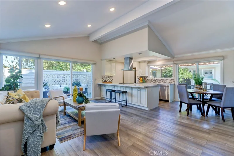 Remodeled "San Clemente" condo cottage perfectly situated inside Gate 7 on a quiet interior street with large greenbelt right outside the front door. Enjoy the beautiful walk-up full of gorgeous trees and grass - a nice yard without the maintenance! Walk right in to this stunning remodel featuring vinyl plank flooring, smooth ceilings, crown molding, recessed lights, dual pane windows with custom roman blinds, washer/dryer and paneled interior doors. Living/great room is enhanced with a vaulted ceiling, recessed lighting and contains access to the private patio area with good-sized storage shed. The open kitchen has a stainless hood over the breakfast bar providing a beautiful focal point to complement the quartz counters, tile backsplash, recessed and pendant lighting, timeless off-white cabinets, stainless appliances and modern refrigerator. Enjoy all the additional storage under the breakfast bar. This area has an east-facing window over the kitchen sink and slider out to the shared courtyard. Guest bedroom has ceiling fan, mirrored closet door and sunny southern outlook. The adjacent remodeled guest bathroom provides a beautiful space for your visitors including large vanity with ample counter space and gorgeous tiled walk in shower with glass enclosure. Continuing down the hallway to the primary en-suite, you'll pass a stack washer/dryer in the hall closet and brand new water heater (being installed) in the hall closet. Primary en-suite has another beautiful bathroom housing a larger tiled shower with seat. Primary bedroom is brightened by a large west facing window and cooled with a ceiling fan. This great condo is naturally bright thanks to the windows oriented in different directions complemented by tranquil surroundings - the perfect Laguna Woods retreat! Laguna Woods Village residents enjoy a 27-hole championship golf course, a 9-hole executive par 3 course, pickleball and tennis courts, lawn bowling, gyms, clubhouses, swimming pools, horse stables, gardening centers, artist studios, computer workrooms and classes + over 200 clubs and organizations.