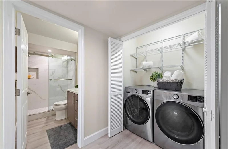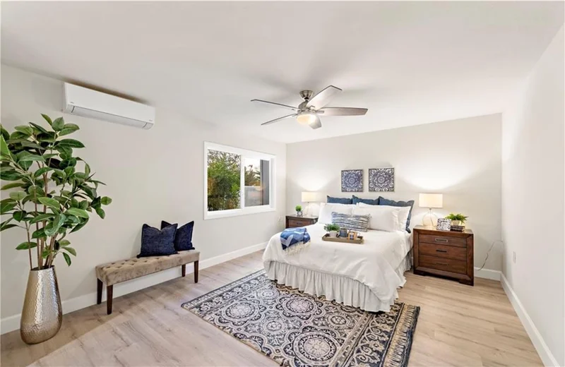 Welcome to this beautifully remodeled, single-level, no-stairs Catalina condo located in the guard-gated 55+ community of Laguna Woods Village. This 2-bedroom, 2-bath residence with 1-car garage, has been thoughtfully renovated with designer finishes and high-end upgrades throughout, offering a truly move-in-ready home. Enter through a spacious private courtyard and impressive mahogany-and-glass front door into a light-filled interior featuring new dual-pane vinyl windows, fresh paint, new flooring, and modern fixtures. The open living area is warm and inviting with recessed LED lighting and a cozy electric fireplace, perfect for relaxing or entertaining. The stunning kitchen showcases quartz countertops, soft-close cabinetry, an oversized sink, porcelain tile backsplash, stainless steel pull-out shelving, and new Samsung fingerprint-resistant appliances. Both bathrooms have been completely remodeled with large porcelain-tiled walk-in showers, including an expanded primary shower with an enclosed bench seat. Comfort is enhanced by a Fujitsu mini-split heating and air conditioning system providing individual climate control for each room. Enjoy indoor-outdoor living on the expansive covered patio with added privacy landscaping ideal for morning coffee or evening gatherings. Additional highlights include a brand-new LG washer and dryer, upgraded Kohler and Moen plumbing fixtures, Kohler toilets with GFCI receptacles for bidet seats, and a finished garage with a new aluminum overhead door and LiftMaster opener with battery backup. Residents of Laguna Woods Village enjoy an exceptional resort-style lifestyle with golf courses, pools and spas, fitness centers, tennis and pickleball courts, equestrian facilities, performing arts, countless clubs, free transportation, and 24-hour security, all just minutes from Laguna Beach and major conveniences.