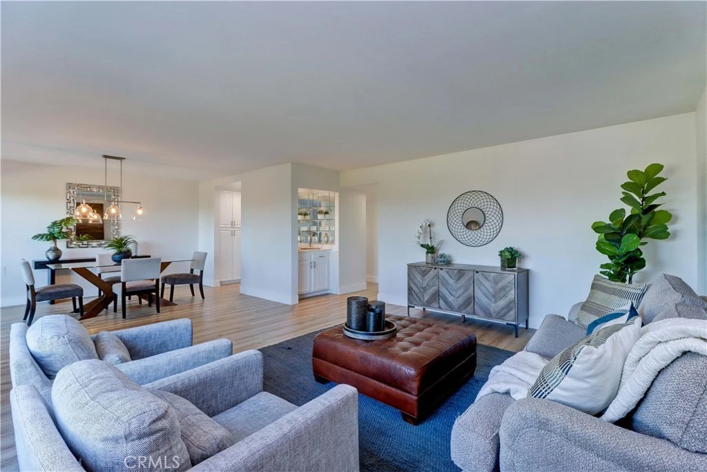 View! View! View! Take in breathtaking northern views towards Irvine, with majestic mountains in the distance, sparkling city lights at night, and even snow-capped peaks during the winter months. This beautifully remodeled second-floor “Sierra” condo offers a peaceful setting paired with everyday convenience. Ideally located directly across from Clubhouse 6, the home is easily accessible from Gates 9 or 10 and is close to the elevator, laundry room and carport—making daily living simple and stress-free. Inside, the home feels fresh and inviting with brand-new vinyl plank flooring, fresh paint, and energy-efficient dual-pane windows throughout. Remodeled kitchen is designed with newer cabinetry, quartz countertops, recessed lighting, white appliances, and updated stainless fixtures. The adjacent dining area features a stylish light fixture and opens to the balcony—perfect for enjoying the view and fresh air. Spacious living room is centered around a large picture window that fully captures the stunning scenery. A heat pump provides efficient heating and cooling and vintage wet bar adds character and a touch of nostalgia—ideal for entertaining or relaxing at home. The sleeping areas include two comfortably sized bedrooms with ample closet space and pleasant southern exposure that brings in soft natural light. Both bathrooms have been updated with quartz-topped vanities, modern faucets, and fixtures. The guest bathroom offers a convenient tub/shower combination, while the primary bathroom features an easy-access walk-in shower. This move-in-ready condo offers the perfect blend of scenic beauty, thoughtful updates, and low-maintenance living—an ideal place to enjoy everything Laguna Woods Village has to offer and provides a wonderful opportunity to enjoy comfort, community, and unforgettable views. Residents enjoy an exceptional lifestyle with access to championship and executive golf courses, swimming pools, fitness centers, pickleball and tennis courts, lawn bowling, multiple clubhouses, horse stables, gardening centers, art studios, computer labs, educational classes, and over 200 clubs and organizations.