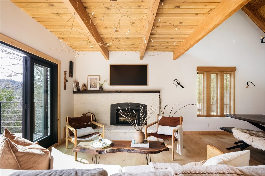 A rare blend of modern elegance and natural serenity, this beautifully reimagined contemporary cottage offers refined living tucked beneath a canopy of trees with peaceful lake views. From the moment you arrive, a natural rock and stone pathway leads from the level parking area to the front entry, creating a warm and welcoming approach that blends seamlessly with the surrounding landscape. This 3-bedroom, 3-bath home with a spacious game room and loft is crowned with a durable metal roof and thoughtfully positioned for both privacy and ease. A charming stone walkway guides you to the inviting front deck, setting the stage for the craftsmanship and care found throughout. Inside, every finish has been intentionally curated — from rich wood flooring and designer stone and tile accents to vaulted, beamed ceilings that create an airy yet inviting atmosphere. Welcoming lake views and lush treetop vistas filter through abundant windows, filling the home with natural light and tranquility. The open-concept main level is warm, refined, and effortlessly functional. Expansive french patio doors extend the living space outdoors to a spectacular deck, where panoramic treetop and lake views create a true sanctuary in the trees. The seamless indoor-outdoor flow makes this home ideal for both intimate evenings and lively gatherings. Each level features its own bedroom, offering privacy and flexibility for guests or multi-generational living. Upstairs, a private bedroom and bath are complemented by a generous loft — the perfect space for reading, relaxing, or simply enjoying the peaceful scenery.The lower level enhances the home’s versatility with a spacious game room complete with built-in cabinetry, a half bath, and an oversized laundry closet. An additional bunk room and direct exterior access make this level ideal for entertaining, recreation, or hosting overnight guests, with room for expanded outdoor enjoyment. The kitchen showcases updated appliances, including a distinctive retro style refrigerator and freezer that add both character and functionality. Contemporary cable railings framing the staircase and loft serve as a striking architectural feature, enhancing the home’s clean lines and elevated aesthetic. More than a cottage, this is a thoughtfully designed retreat where timeless natural elements and modern sophistication come together in perfect harmony. This home is located in Arrowhead Woods and has Lake Rights
