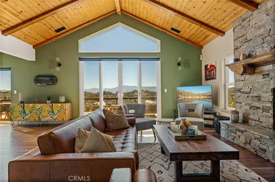 This home is what Lake View dreams are made of and this home has LAKE RIGHTS! This highly updated and FULLY permitted A-Frame Cabin and detached Guest Studio are a must-see. Very rarely will you find anything as custom and unique with new high high end finishes throughout and comes FULLY furnished and very well stocked with anything and everything you need from the kitchens to the bathrooms, bedrooms, downstairs den, patios, and guest studio and is impecably decorated down to every little detail. As soon as you enter the main house, it's a mezmerizing experience with the soaring ceilings and windows which flood the entire room with beautiful natural light...and that VIEW!!! On the main level is the living room with mounted TV and Sonos, a brand new expanded deck, perfect for entertaining or watching the sun rise over the lake with that morning cup of coffee. There is also a remodeled kitchen w/quartz counters, french sink, new cabinetry and stainless appliances, 2 bedrooms including the Primary with a $9K queen sleep number i8 bed and en-suite bathroom, and a full hall bathroom. Upstairs is a loft, a large 2nd bedroom, full bath, and a walk in closet which also has a cozy little cubby with 2 more children's beds! The lower level is a den with a cozy fireplace, Leather furniture, TV, oversized laundry room with new LG steam washer and dryer, and direct access to the huge fully furnished deck where there's a gas fire pit and BBQ. Now about this darling guest cottage with it's own balcony and rocking chairs. Inside there's a queen bed, full kitchen with stove, microwave, new fridge, closet, desk and new OLED TV, and remodeled bathroom. You'll NEVER want to leave! Too many features to mention but here are some highlights: Rare oversized lot that is Fully Fenced oversized 2 garage with a huge bonus room above which can be used in various ways, new driveway and parking area fitting a total of 6 cars, New AC, New Tankless WHs in both homes, new loft railing, part of the roof is brand, new dual pane windows,whole house water filtration for both homes, new LED lighting throughout, many smart home upgrades including wifi garage door, Nest thermostats,Nest hardwired cameras, Nest smoke and CO2 alarms, smart light switches,smart water monitor and shutoff, new rain gutters, fully permitted Electrical Panel upgrade, EV charging outlet (charger not included), new high end window treatments and Netgear Wifi6 mesh networking hardware. Enjoy Lake Life at it's best!