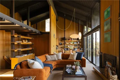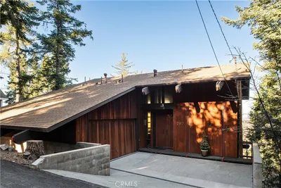 Step back in time at 287 Grizzly Road, a 1967 mid-century modern residence—originally designed by AIA architect R. Neil Manos and known as the “Mountain Cabin”—with lake views and a wealth of original features. Vertical cedar siding anchors the captivating exterior of the home amid towering pines. Inside, the main floor boasts vaulted ceilings with exposed beams and eye-catching, unique architectural elements, floor-to-ceiling windows, and sweeping lake and mountain views. A wood-paneled living area with a wood-burning fireplace opens to a formal dining space adorned by two notable Herman Miller Nelson pendant lights, original built-in shelving reflecting the home’s signature red stripe—carried from the front of the house throughout the interior and out onto the decks—and a lake view, adjacent to an updated galley kitchen. Expect authentic mid-century details, including the three original Herman Miller light fixtures, an open-back built-in, and a sunken wet bar, an unexpected detail for added entertainment. Sliding doors flank the fireplace, opening to a spacious deck for lounging, dining, and embracing the unparalleled lake and mountain views. The main floor is complete with a powder room adorned with original mid-century modern sconces. Down the original pebble-stone and concrete stairs are two full baths and three ample-sized bedrooms, one serving as a recreation and bunk room. Each bedroom offers tree views and exposed wood beams. One bath remains a 1960s time capsule with original tile and wood paneling. This home is a true collectors piece. Other amenities include a two-car garage and an oversized parcel with outdoor living potential. Ideally located with close proximity to North Bay, Blue Jay, the Lake Arrowhead Country Club, and nearby hiking trails. Lake Rights are included with the purchase of this home. Prime North Bay dock available for additional price.
