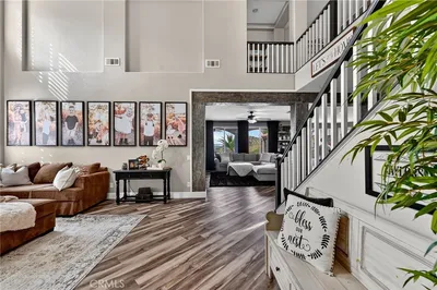 Welcome to what is arguably one of the most beautiful homes in all of Canyon Hills, perfectly positioned on what may be the best lot in the entire community. Inside, the home has been fully remodeled with a clean, elevated feel that still feels warm and livable. You’ll find luxury vinyl plank flooring throughout, a completely upgraded kitchen with custom marble countertops, a detailed stone inlay backsplash, a waterfall island, and black stainless steel Samsung appliances that tie it all together. The living space is anchored by a built-in entertainment center, creating a natural place to gather and unwind. As you enter, custom wood-wrapped pillars frame the transition into the living area and immediately set the tone for the level of detail throughout the home. The layout offers 4 bedrooms, a dedicated office, and a spacious loft, giving you flexibility for whatever stage of life you’re in. The primary suite has its own standout features, including a barn door accent and direct access to a private deck where you can take in incredible views of the mountains and Canyon Lake. Additional upgrades include solar and an epoxy-coated garage that’s as clean and polished as the rest of the home. And then there’s the backyard. Designed to feel like your own private escape, the space is filled with lush, exotic landscaping, including a producing banana tree, and a custom flagstone-wrapped pool with a sun step, built-in bar, and plenty of room to entertain. The views are unreal, stretching across the mountains and Canyon Lake, with the added bonus of front-row seats to Fourth of July fireworks right from your own home. Homes like this rarely come available, especially with this combination of upgrades, layout, and lot. It’s one you truly have to experience in person.