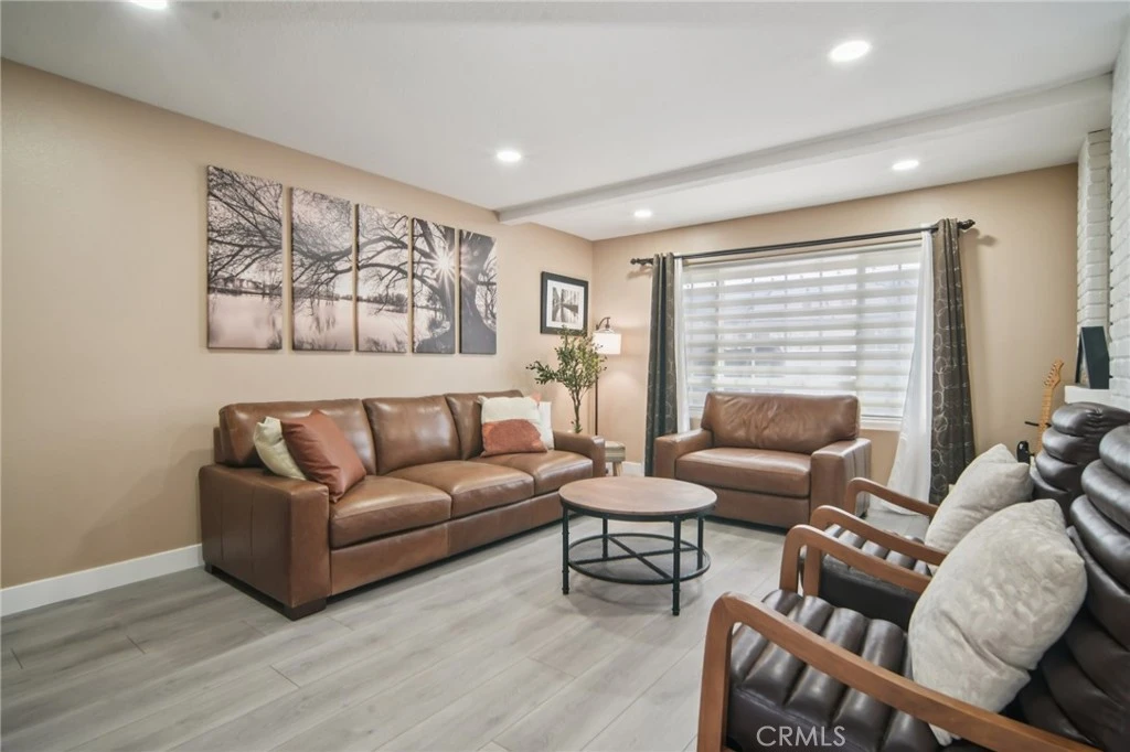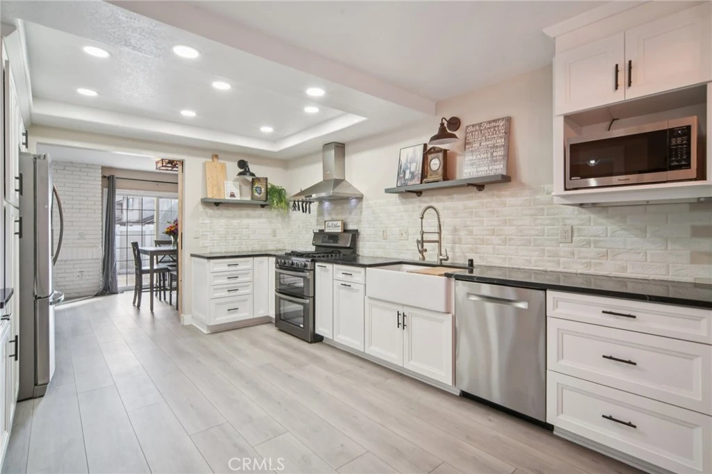 Located in the desirable Serrano Highlands neighborhood of Lake Forest, this beautifully upgraded home offers a welcoming blend of style, comfort, and thoughtful improvements throughout. Most of the interior has been freshly painted in neutral designer tones (excluding secondary bedrooms), complemented by premium laminate flooring on both levels, including all bedrooms. Upgraded wood stairs with stained treads and risers, wide baseboards, and enhanced door casings add to the home’s refined appeal. Dual-pane energy-efficient windows and a sliding glass door provide comfort and efficiency, while recessed LED lighting and new, updated ceiling fans in the downstairs living areas enhance the bright and modern feel. The entry welcomes you with a stylish accent wall featuring custom wainscoting. The fully remodeled kitchen is a standout, featuring premium wood cabinetry with soft-close drawers, granite countertops, a ceramic-coated farmhouse sink, and a Fapully commercial-style single-handle pull-down sprayer faucet with LED light. Stainless steel appliances include a double oven range, metal hood, and Bosch quiet dishwasher, with recessed lighting and updated electrical completing this functional and inviting space—ideal for everyday living and entertaining. Plumbing and mechanical upgrades include a whole-home PEX re-pipe and a new high-efficiency water heater, offering peace of mind for years to come. All bathrooms have been tastefully updated, highlighted by the remodeled primary bathroom with a double-sink vanity topped with Carrara marble, Kohler faucets, and a custom tiled shower with built-in seat and niche, frameless glass enclosure, upgraded lighting, fan, and flooring. The powder room and hall bathroom have also been refreshed with new vanities, fixtures, flooring, and finishes. The primary suite features premium flooring, a multi-setting ceiling fan/light, and a custom walk-in closet system with built-in cabinetry and drawers. Additional storage is available in the attic above the garage, complete with a convenient pull-down stair access. Outside, the front patio has been transformed into a low-maintenance space with woodchips and drought-tolerant landscaping. Serrano Highlands is a family-friendly community with HOA-hosted events throughout the year, making this move-in ready home an exceptional opportunity in a sought-after Lake Forest neighborhood.