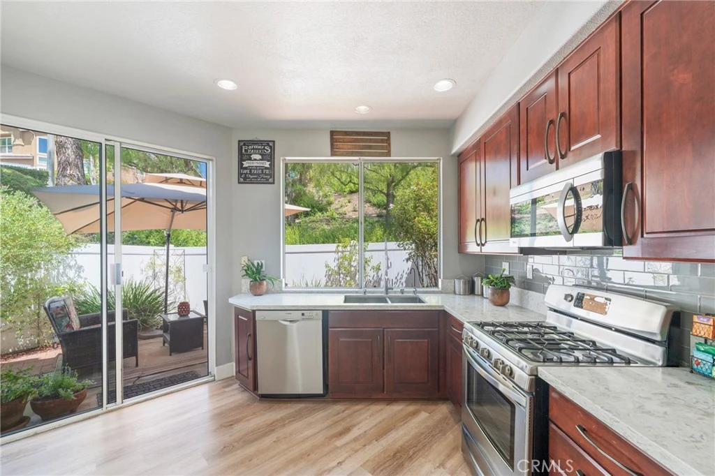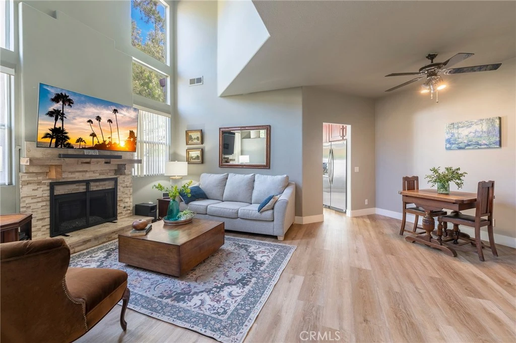 Welcome to 28411 Klondike Dr, a beautiful townhome located in the highly desirable Portola Hills neighborhood of Trabuco Canyon. The main living area features an open-concept floor plan highlighted by soaring vaulted ceilings, a cozy fireplace, a custom wood-paneled staircase, and expansive windows that bring in abundant natural light. The open kitchen is well-equipped with rich wood cabinetry, stone countertops, subway tile backsplash, stainless steel appliances, and upgraded flooring throughout the entry. Upstairs, you will find comfortable bedrooms, including the primary suite, and a flexible space perfect for a home office. An attached two-car garage provides direct access. The Montecido community offers incredible resort-style HOA amenities, including a clubhouse, swimming pool, spa, and fitness center. The neighborhood features scenic, accessible streets that are especially picturesque during the holidays, close to O’Neill Regional Park and Whiting Ranch Wilderness Park. Enjoy ultimate convenience with a Starbucks at the end of Glenn Ranch Road and major shopping centers only five minutes away. A block away from Portola Hills Elementary School within the Saddleback Valley Unified School District.