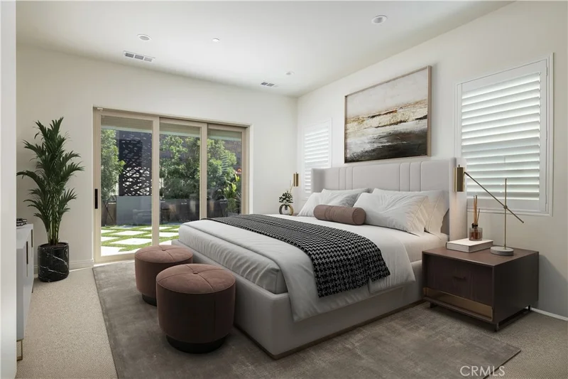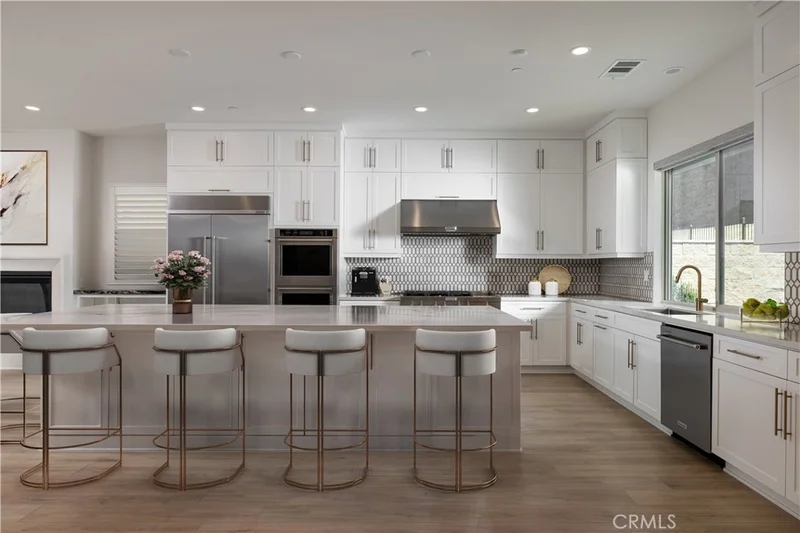 Newer construction (built in 2022), dramatic voluminous ceilings, two first-floor en suite bedrooms, and a versatile 5-bedroom-plus-loft floor plan define this exceptional residence in the gated community of The Oaks at Portola Hills. Designed for flexibility and modern living, the home blends fresh contemporary style with everyday comfort while offering the rare convenience of dual main-level suites. Under soaring ceilings, the great room opens through pocket sliding doors to the private backyard, creating a seamless indoor-outdoor connection. The kitchen features quartz countertops, a stone and porcelain mosaic backsplash, soft-close cabinetry, a large eat-in island, and a walk-in pantry plumbed for a beverage cooler. Commercial-grade KitchenAid appliances include a six-burner gas cooktop with built-in electric grill and two full built-in ovens—all complemented by a fireplace-warmed dining area with a custom lighted china cabinet finished with a granite top. Smart features include a motorized kitchen shade, solar screen at the California room, and three Enviroblind security shields—each with remote and manual operation. Waterproof rigid core luxury vinyl oak plank flooring, plantation shutters, and quartz finishes elevate the interiors. The main-level primary suite opens directly to the backyard and offers a spa-like bath with limestone slab-topped dual sinks, a walk-in shower, and a freestanding soaking tub. Upstairs, an en suite bedroom functions as a second primary, while a loft/media room provides additional flexibility for entertaining or a home office. Two additional bedrooms—currently configured as offices—feature updated baths with quartz finishes and glass enclosures. The backyard combines stone and turf for a low-maintenance retreat. Additional highlights include seller-owned solar, Honeywell-controlled systems, EV charging, instant hot water call buttons, and two garages: a finished two-car garage plus a separate one-car garage. Residents enjoy resort-style amenities including a pool, clubhouse, BBQ area, dog parks, sports courts, and over 1.5 miles of hiking trails, with convenient access to the 241 Toll Road and proximity to Irvine Spectrum.