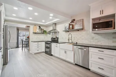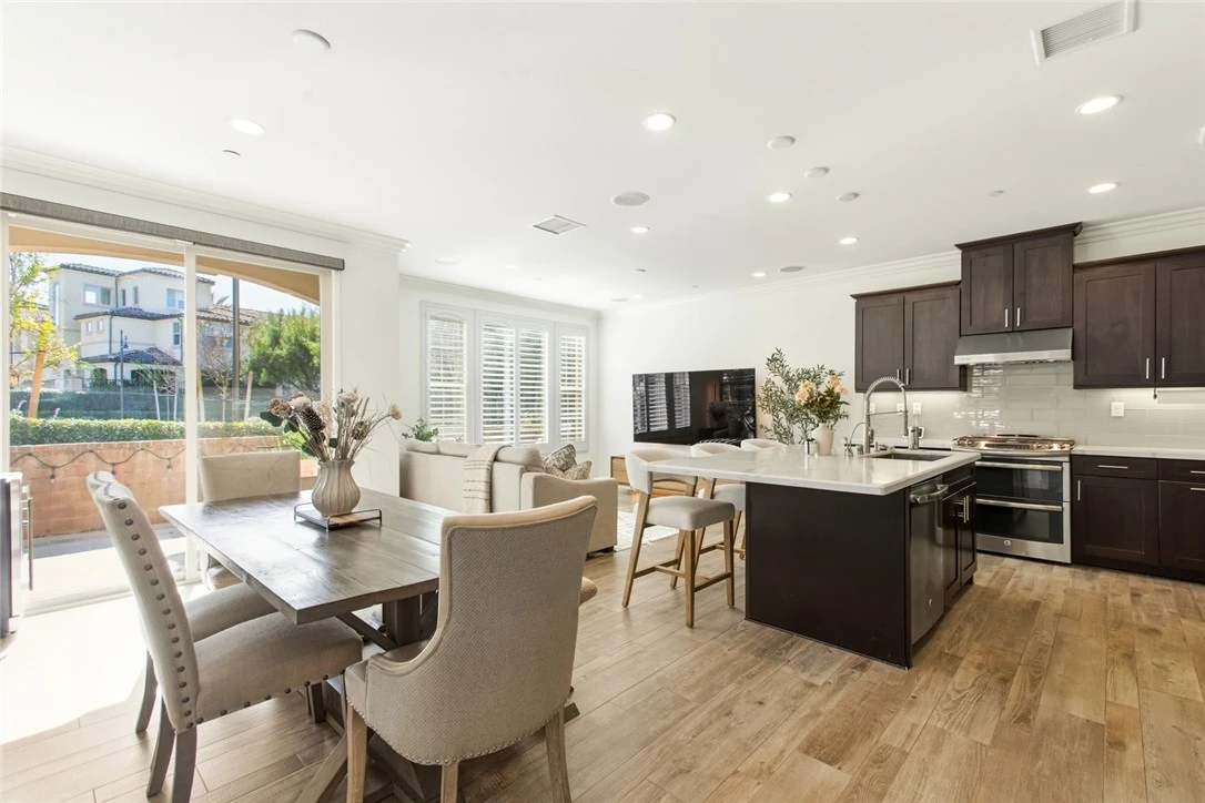 Premium corner end-unit in Baker Ranch with no front neighbor, abundant natural light, and serene views of greenery and a tot lot. This 3-bedroom, 2.5-bath home offers 1,655 sqft of modern living space with a bright, open floor plan. Step inside to discover a home filled with thoughtful upgrades: porcelain tile floors on the main level, wood laminate upstairs, recessed lighting, crown molding, and plantation shutters throughout. The Chef's kitchen features stainless steel GE appliances, quartz countertops, soft-close cabinetry, and custom pull-out drawers. Upstairs, the spacious primary suite is a peaceful retreat, complete with a walk-in closet with built ins, glass shower, dual vanities, and separate toilet room. Secondary bedrooms share a remodeled Jack-and-Jill bath with custom lighting, while a separate laundry room with washer and dryer adds everyday convenience. Practical touches abound, including dual-zone HVAC with Nest thermostats, a newer water heater, a saltwater softener, and an epoxy-floored garage with top storage racks. Outside, the corner patio invites relaxation, gardening, or cozy evenings around a fire pit. Life at Baker Ranch means more than just a home. Residents enjoy exceptional community amenities, including pools and spas, clubhouses, parks, playgrounds, sport courts, open fields, and scenic trails surrounded by open space and foothill views. Conveniently located near freeways, shopping, dining, entertainment, and top-rated schools. Low HOA dues and no Mello-Roos. 47 Finch is the perfect place to call home - blending modern comfort, thoughtful upgrades, and a vibrant community lifestyle!