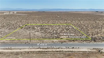 APN: 3260-002-005 Coordinates: 34.819833, -118.241750 2.27 Acres for sale in LA County. This lot is located near the corner of W Ave A and 60th ST W in Lancaster, CA. Excellent property with frontage on to a paved street that has light poles on the street.