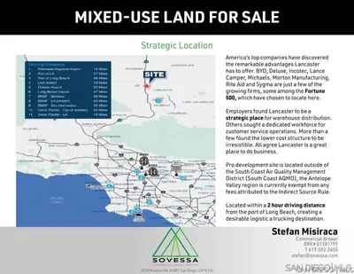 40 acres of prime mixed-use land at the signalized intersection of Avenue H and 30th Street in Lancaster. Zoned for Mixed-Use, allowing multi-family (15-30 units/acre, up to 430 units), business park, and light industrial, this site is ideal for investors or developers seeking to capitalize on the regions growth. With all utilities available in the street, off-site infrastructure on W Avenue H, and proximity to a freeway off-ramp, the property offers excellent visibility and access. Adjacent to the Antelope Valley Fairgrounds, currently undergoing a 90 Million expansion, the site is poised for success in a thriving market. Antelope Valleys aerospace hub, anchored by Northrop Grumman, Lockheed Martin, and NASA, employs over 20,000 well-paid professionals. Long-term contracts, including 80 Billion for B-21 bomber jets, AI and robotics programs, and the Supersonic X-Plane, drive economic growth. Increased activity at USAF Plant 42 creates immediate technical and assembly jobs, with over 2,500 new positions generating 6,000+ support jobs locally. Lockheed Martins new 208,000 SF high-tech manufacturing facility (2022) highlights the regions commitment to growth. With no new apartment construction in over 30 years, the Antelope Valleys affordability fuels a robust rental market, making this site a prime opportunity. Strategic Location: 40 acres across four parcels at a hard corner signalized intersection with excellent visibility, minutes from a freeway off-ramp. Flexible Zoning: Supports multi-family (up to 1,200 units), business park, or light industrial development. Development-Ready: Utilities in the street and off-site infrastructure on W Avenue H in place. Nearby Growth: Adjacent to the 90 Million Antelope Valley Fairgrounds expansion, with 4 Million SF of industrial space in plan check and seven residential communities under development nearby. High Demand: Severe housing shortage with strong rental demand driven by affordability and aerospace job growth. Economic Momentum: Aerospace-driven job creation and major investments position Lancaster for long-term growth.