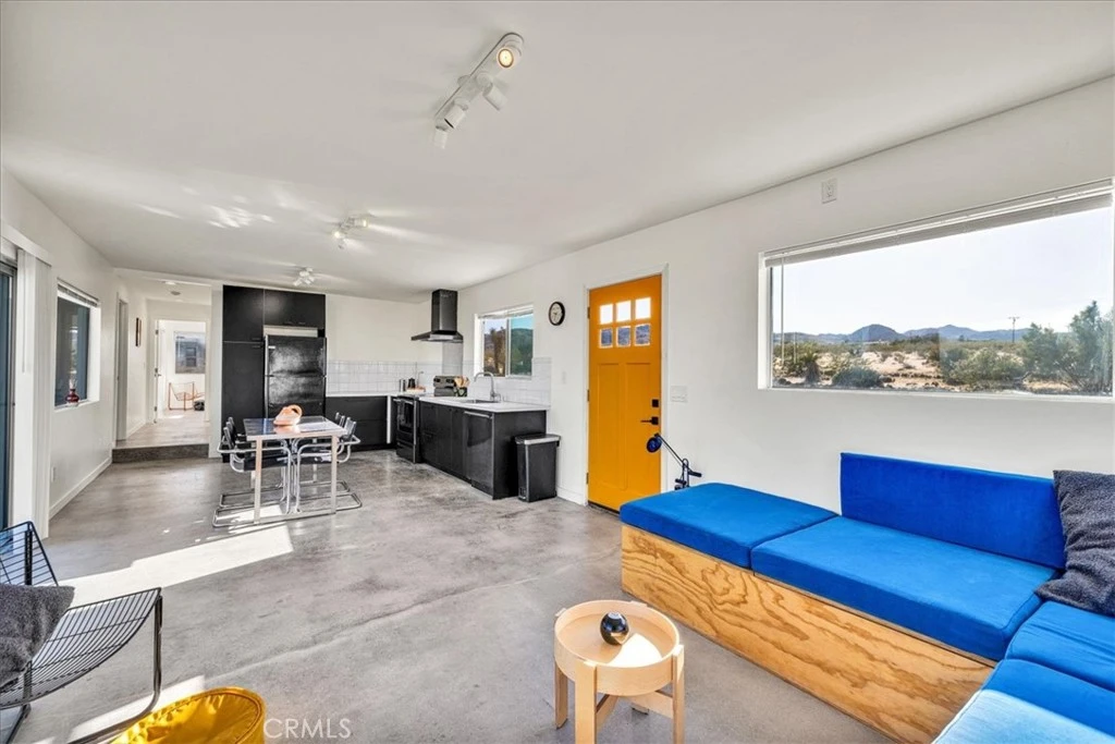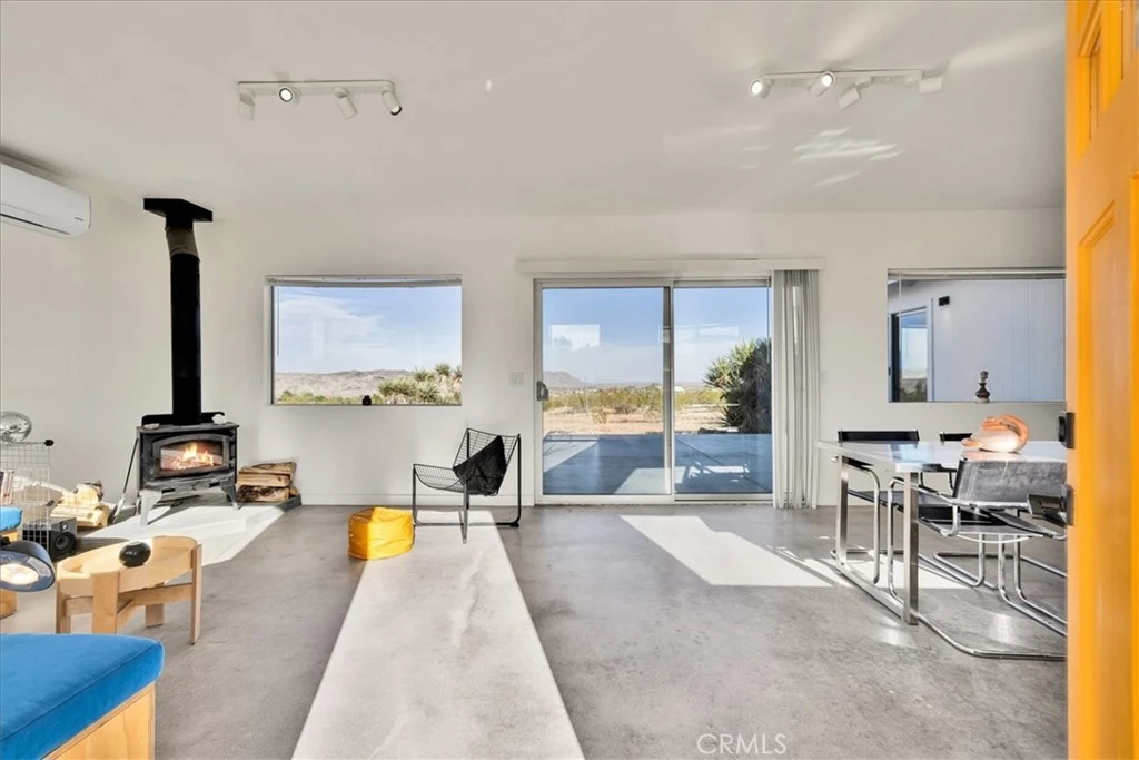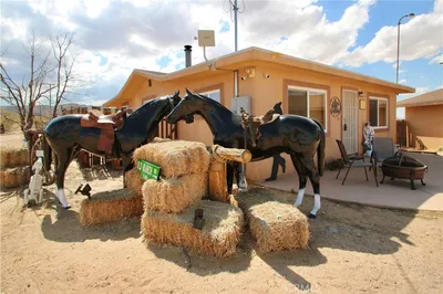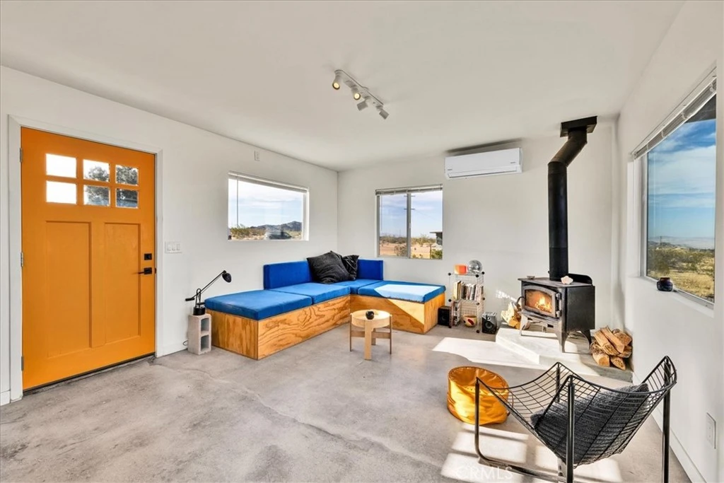 Set on 2.5 acres in the heart of Landers, this fully rebuilt and thoughtfully expanded 2-bedroom, 2-bath home offers striking, unobstructed views of Goat Mountain right from the center of the property. Nearly everything is brand new, blending modern efficiency with artistic character. Inside, the bathrooms are a true highlight, featuring a deep soaking tub perfectly positioned beneath a window and finished with vibrant, colorful grout that adds a unique designer touch. The living room is anchored by a cozy wood stove and a custom-designed sofa with integrated storage (removable if desired), while energy-efficient mini splits provide year-round comfort in both hot desert summers and cool winter nights. A dedicated laundry area adds everyday convenience. Outdoors, two patios create ideal spaces for relaxing or entertaining under the wide-open desert sky, highlighted by a mature Joshua tree—a special and increasingly rare feature in this part of Landers. The property also includes two sheds—one well-suited as an art studio or home office—and a vintage Airstream that can be included in the sale, adding extra charm and flexibility. Located just one block from pavement for easy access, and within close proximity to local favorites like the Integratron, Gubler’s Orchids, and La Copine, this home is also just 25 minutes to Joshua Tree National Park and 20 minutes to Pappy & Harriet’s, making it a perfect full-time residence, weekend escape, or investment opportunity. Please note, current owner is paying $4,503 in annual tax, some platforms did not update to show correct amount.