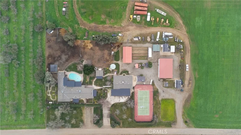 Combined 6,369 sq ft gated ranchette estate on nearly 39 acres featuring a 3,970 sq ft main residence, 2,129 sq ft detached ADU/game room, and 270 sq ft pool house. Designed for lifestyle and flexibility, the property offers 3 bedrooms, 4 baths, office/gym, open entertaining kitchen with walk-in commercial refrigerator, walk-in pantry/cooler, and built-in Jenn-Air units. Resort-style amenities include in-ground pool, full-size lighted tennis court, 40x60 shop, 4-stall horse paddock, covered patio, landscaped yard, and multiple storage buildings. Improvements sit on approx. 3.25 fenced acres with remaining prime Class I and II farmland ideal for equestrian, agricultural, or expansion use. Adjoining 28.7-acre parcel with three income-producing rental homes available separately. Rare gated country compound with lifestyle, land, and long-term value.