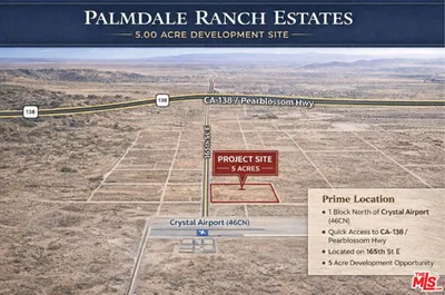 PURCHASED AT $150,000.00 IN 2007. ZONED: LCRA 12000 *SUBDIVISIBLE 12,000SF PER LOT PER HOME PLUS ADU(POSSIBLE) TOTAL LOT SIZE 204,035 SF YOU CAN BUILD TOTAL OF 34 HOMES AMAZING LOT!! UNLIMITED POTENTIAL!! Latitude 34.488376 Longitude -117.834186 DEVELOPMENT OPPORTUNITY PALMDALE, CA Acquisition History Purchased in 2007 for $150,000 PROPERTY DETAILS Zoning: LCRA 12000* Total Lot Size: 204,035 SF (~4.68 Acres) Subdivision Potential: Minimum 12,000 SF per lot Single-Family Homes + ADU potential per lot?? DEVELOPMENT POTENTIAL Estimated Build: Up to 17 Homes (Buyer to verify with City)ADU potential provides additional income per lot Flexible development strategy: Build & sell (for-sale product) Build & hold (rental portfolio) Phased development LOCATION Coordinates: Latitude: 34.488376 Longitude: -117.834186 Located in Palmdale growth corridor with ongoing residential expansion and increasing housing demand. INVESTMENT HIGHLIGHTS Large 4.68-acre parcel with subdivision capability Strong value-add through land entitlement and development Ability to create multiple income streams (homes + ADUs)Attractive price basis vs. development upside Ideal for builders, developers, and long-term land investors POSITIONING (THIS IS IMPORTANT) Rare large-lot subdivision opportunity with the ability to create a 30+ unit residential project in a growing Palmdale market. (Professional Add-On) Buyer to verify zoning, density, subdivision, and development feasibility with City of Palmdale Infrastructure (utilities, grading, access) to be confirmed STRONGER BUYERS "One of the few remaining large parcels in Palmdale offering subdivision scale with ADU upside positioned for both for-sale development and long-term rental portfolio creation. "MOST OF THE SUBDIVISIONAL LANDS ARE EITHER 1 ACRE PER HOME OR 2.5 ACRE PER HOME. THIS ONE IS 12,000 SF PER HOME
