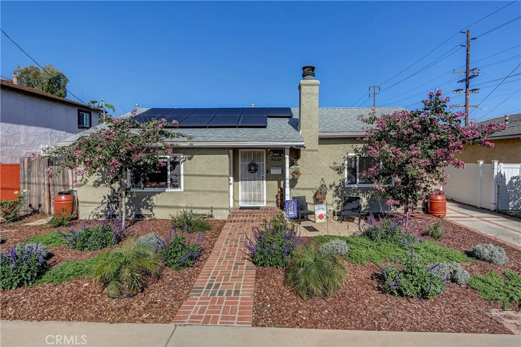 "Home Sweet Home", this home is beautifully upgraded and totally turnkey. 3 bedroom ( 2 of them are huge). Eat-in kitchen with Quartz counters, bright white cabinets and stainless appliances, the kitchen opens up to a deck - perfect for the barbque. 2 beautifully appointed bathooms, Seller's added the 2nd bath with permits in 2023. Living room with cozy fireplace. Huge flat lot. The backyard is an entertainer's delight with plenty of room for the kids to play and slab for the outdoor funiture and a firepit. You are greeted with a beautifully designed and low maintenance front yard. 2 car detached garage with tons of storage and washer and dryer. Long driveway for extra parking. The roof is 4 years old and the Solar Panels are owner owned.