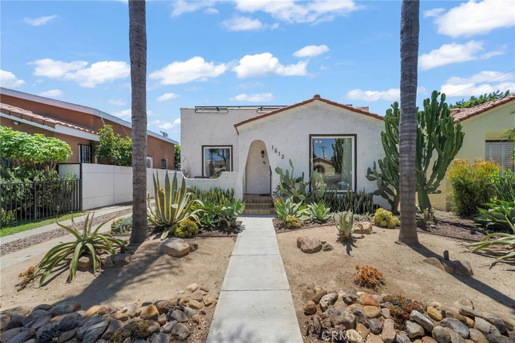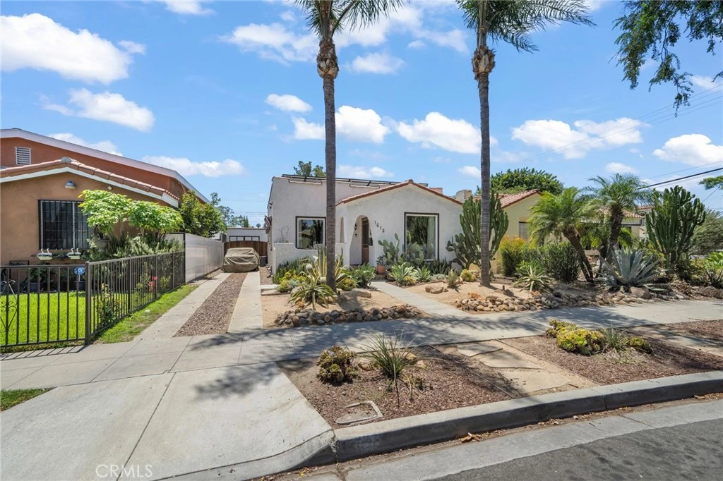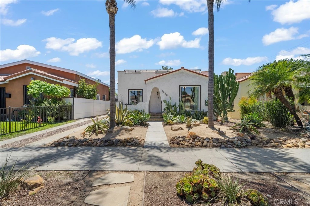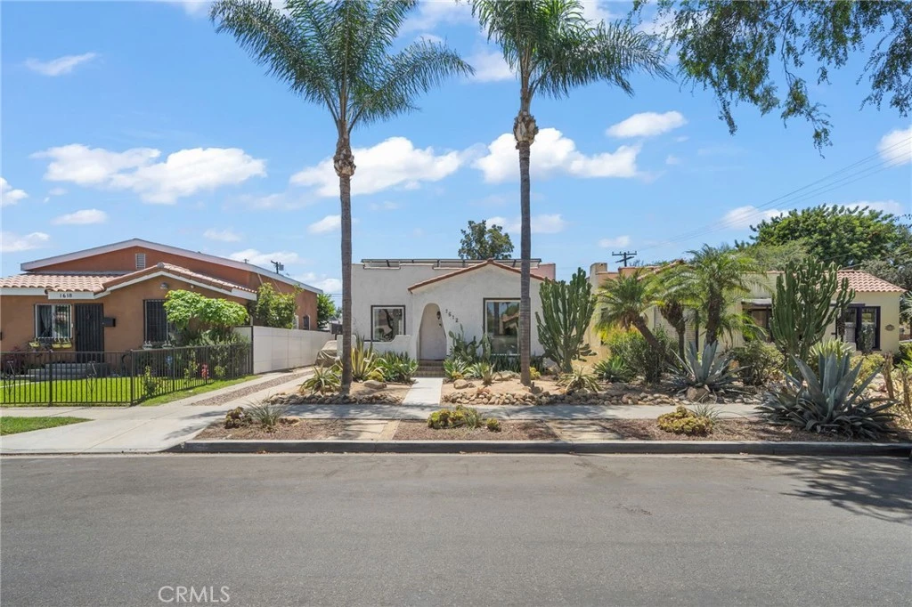 Timeless Spanish-style architecture meets modern comfort in this beautifully maintained single-story 2-bedroom, 1-bath home with a bonus outdoor office, paid-off solar, and a detached one-car garage, located on a picturesque palm-lined street in Long Beach. The classic stucco exterior, arched details, and drought-tolerant landscaping showcase the home’s authentic Spanish charm. Inside, the light-filled living room features a large picture window, neutral finishes, updated lighting, and wood-style flooring throughout the main living areas. An elegant arched opening leads to a spacious formal dining area with a statement chandelier and multiple windows, ideal for everyday living and entertaining. The dining area flows into a cozy sitting nook and a bright contemporary kitchen with shaker-style soft-closing cabinetry, ample storage, and a functional layout. This turnkey home also includes a dedicated laundry area and a newly finished backyard shed (~120 sq ft) with windows, mini-split HVAC, and a lighted wood deck—perfect as an office, studio, gym, or creative retreat. The well-designed floor plan offers comfortable bedrooms with custom closets and a tastefully updated bathroom. A glass door opens to an entertainer’s paradise featuring a draped pergola, mature fruit trees—three orange, two grapefruit, and one fig, pavers, and a grassy area—creating a serene setting for outdoor al-fresco dining and gatherings. This inviting home and tranquil outdoor retreat offer warmth, craftsmanship, and a true place to relax and reconnect.