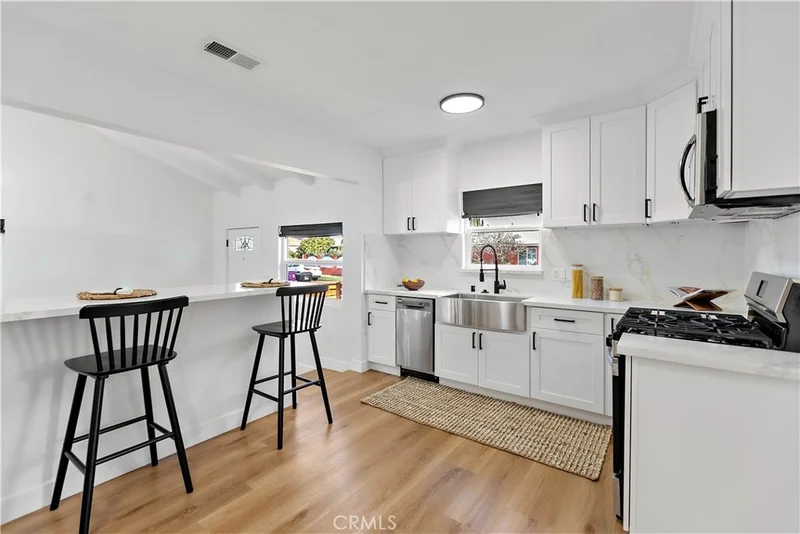 Beautifully remodeled 2-bedroom, 1-bath single-story home on a desirable corner lot in North Long Beach. With 1,012 sq ft of living space, this residence combines cathedral ceilings that create an open, airy feel, complemented by luxury vinyl plank flooring throughout. The upgraded kitchen features granite countertops, new stainless steel appliances, updated lighting with a functional layout. Major improvements include new plumbing, new ceiling fans, and central heating and air controlled by a Nest thermostat for year-round comfort and energy efficiency. The home sits on a 2,568 sq ft lot offering low-maintenance outdoor space with room to personalize. The corner location adds curb appeal and is conveniently located near schools, parks, shopping, dining, and freeway access, this home delivers modern finishes in an established Long Beach neighborhood.
