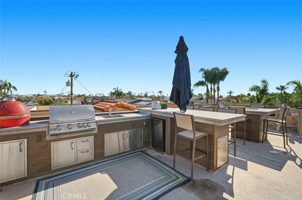 NEW PRICE!!! Stunning, designer Naples Island home just steps from the waterfront and adjacent to the upscale second street restaurants in the beautiful luxury neighborhood of the Belmont Shore offering exceptional value, luxury finishes, and an expansive rooftop deck with spectacular 360° water and city views. Built in 2006, this coastal residence showcases an impressive open-concept layout with soaring two-story ceilings, dramatic window displays that flood the home with natural light, and beautiful travertine and hardwood floors throughout. The highly upgraded chef’s kitchen is equipped with premium stainless-steel appliances including Wolf range and hood, Wolf double ovens, and a Sub-Zero refrigerator, centered around a functional island ideal for cooking and entertaining. The spacious Great Room flows seamlessly to an outdoor patio, creating the perfect indoor-outdoor living environment. The main level also features a private fourth bedroom plus a home theater or dedicated office option, and a massive three-car garage. Retreat upstairs to the expansive primary suite complete with an adjacent sitting room ideal for work, relaxation, or a home gym. Enjoy ocean breezes from the private balcony. Dual walk-in closets lead to the spa-inspired primary bath featuring a jetted soaking tub, steam shower, double sink vanity, and a separate makeup vanity for getting ready for nights out in nearby Belmont Shore and Naples. Two additional generous bedrooms complete the second floor, including an ensuite bedroom and a shared balcony. The show-stopping rooftop deck is built for top-tier entertaining with panoramic views, a built-in BBQ, smoker, refrigerator, and sink, perfect for hosting gatherings or enjoying peaceful sunsets over the bay. Additional amenities include built-in Sonos speakers, recessed lighting, and thoughtful designer upgrades throughout. Experience luxury coastal living at its finest in this exceptional Naples Island home.