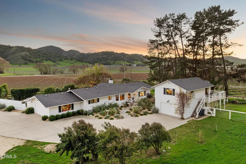 Located in the heart of historic downtown Los Alamos, just moments from Bell's, Bob's Well Bread, Full of Life Flatbread, and wine tasting rooms, Cottonwood Creek Ranch offers refined living with country freedom.Set on 4.03+/- flat, usable acres, this fully reimagined 3 bedroom, 2.5 bath ranchette enjoys vineyard and mountain views less than an hour from Santa Barbara. A comprehensive designer-led renovation brings cohesive luxury throughout.Just under 2,500+/- sq. ft. of hardwood flooring, Italian clay walls, hand-applied plaster ceilings, and custom millwork create warmth and architectural depth. The remodeled kitchen features custom cabinetry, marble surfaces, a dramatic granite island, paneled Fisher & Paykel refrigerator, designer chef's hood, and French doors opening to an expansive Sunroom and outdoor entertaining areas.Living spaces include a wood-burning fireplace, beamed ceilings, and picture windows overlooking the surrounding landscape. The primary suite offers a dressing area and spa-inspired bath with soaking tub. Two guest bedrooms provide privacy and garden views.Professionally designed landscaping, new fencing and gates, fire pit lounge, built-in BBQ, and mature trees, including a striking mulberry with swing, create an ideal setting for entertaining. A separate 1 bedroom, 1 bath unit with additional garage offers flexible guest, studio, or income potential.Level acreage supports horses, goats, olives, or boutique vines. Gated, fenced with both city water and a well, and zoned DR1.8 allowing for future development of additional units. A rare opportunity to own acreage in historic downtown Los Alamos, where modern refinement meets relaxed country living.