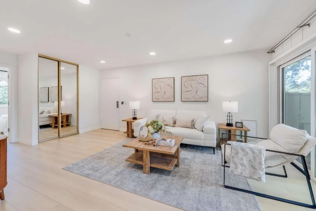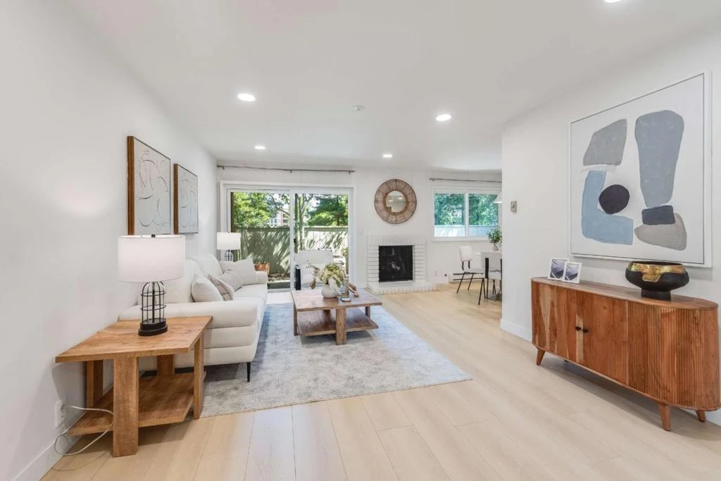 Rare single-level corner unit with no neighbors above or below in the desirable Mercedes Court community in North Los Altos. Ideally located near top-rated schools including Santa Rita Elementary School, Ardis G. Egan Junior High School, and Los Altos High School (buyer to verify). Just minutes from Terman Park and San Antonio Center with shopping, dining, and entertainment. This beautifully updated home features double-pane windows and a remodeled kitchen with stainless steel appliances, granite countertops, backsplash, and recessed lighting. Bright open living and dining areas include a cozy fireplace and access to a private oversized patio. The primary suite offers a walk-in closet and remodeled bath with shower over tub. Second bedroom overlooks mature trees. Updated hall bath with walk-in shower. Additional features include in-unit laundry, covered parking, clubhouse, and secure swimming pool. Easy access to Caltrain and major tech campuses.