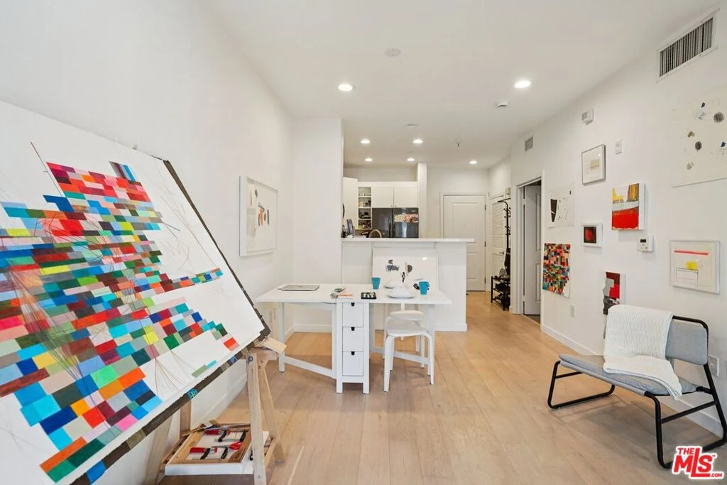 Perched on the top floor, Residence #419 offers a rare sense of volume, light, and creative clarity. Currently serving as the West Coast studio for an accomplished contemporary artist, the space has been thoughtfully refined to support both living and artistic expression. Natural light pours in throughout the day, enhanced by taller ceilings and an open layout that feels airy yet grounded. Recessed lighting adds a gallery-like quality, ideal for showcasing artwork or creating a calm, focused environment. The interior has been carefully updated with engineered light wood flooring set over cork underlay for warmth and comfort underfoot. The bedroom area comes with a large walk-in closet and a built-in wall bed allows the space to transform effortlessly while maintaining openness when desired. Honeycomb shades, operable from both top and bottom, offer nuanced control of light and privacy. The kitchen features newly painted cabinetry and updated appliances. The bathroom has a refinished tub/shower, vanity and textured stone flooring, which brings a subtle, tactile contrast to the clean aesthetic. Additional upgrades include a new HVAC system and an in-unit washer and dryer. A sliding glass door leads to a private balcony overlooking the interior courtyard, extending the living space outdoors. One assigned parking space completes the offering. A refined and flexible top-floor studio, equally suited for creative work, quiet retreat, or modern city living. Set within the amenity-rich Savoy, moments from the culture, dining, and creative pulse of Little Tokyo and the Arts District.