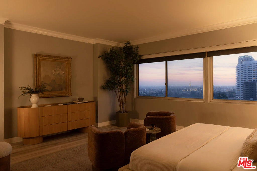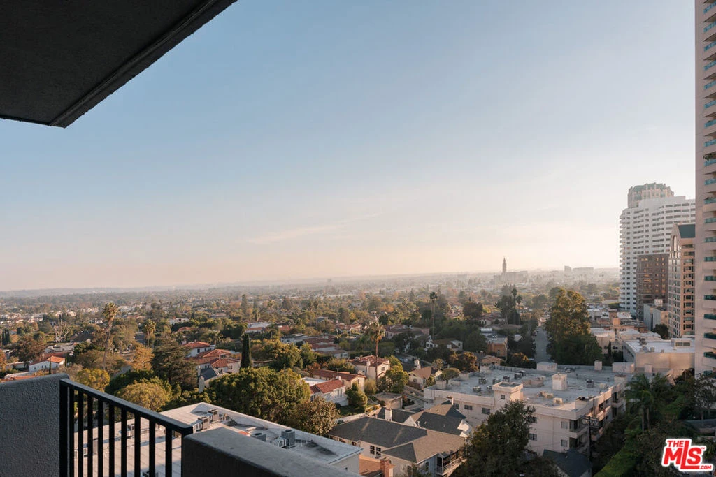 Welcome to The Churchill, a full-service Mid-Century building on the Wilshire Corridor, where this expansive 12th-floor residence enjoys sweeping southwest views and a tranquil rear location. Wake up to remarkable vistas stretching toward the ocean or enjoy dinner on your balcony as the sun sets over the Corridor. This completely remodeled home features one bedroom, one bathroom, and an open-plan living and dining area. The updated and expanded cook's kitchen includes Caesarstone counters, stainless-steel appliances, in-unit laundry, and additional cabinetry with a wine refrigerator, all opening to a sitting area, dining space, and the main living room. The oversized bedroom offers abundant space for both a desk and a sitting area. The Churchill is a pet-friendly building, welcoming cats and small dogs. Amenities include 24-hour security, valet parking, a fitness center, sauna, recreation room, extra storage, and one of the best pools on the Corridor. HOA dues are $1,281 per month and include all utilities, cable, and building amenities. Centrally located near UCLA and Westwood Village.