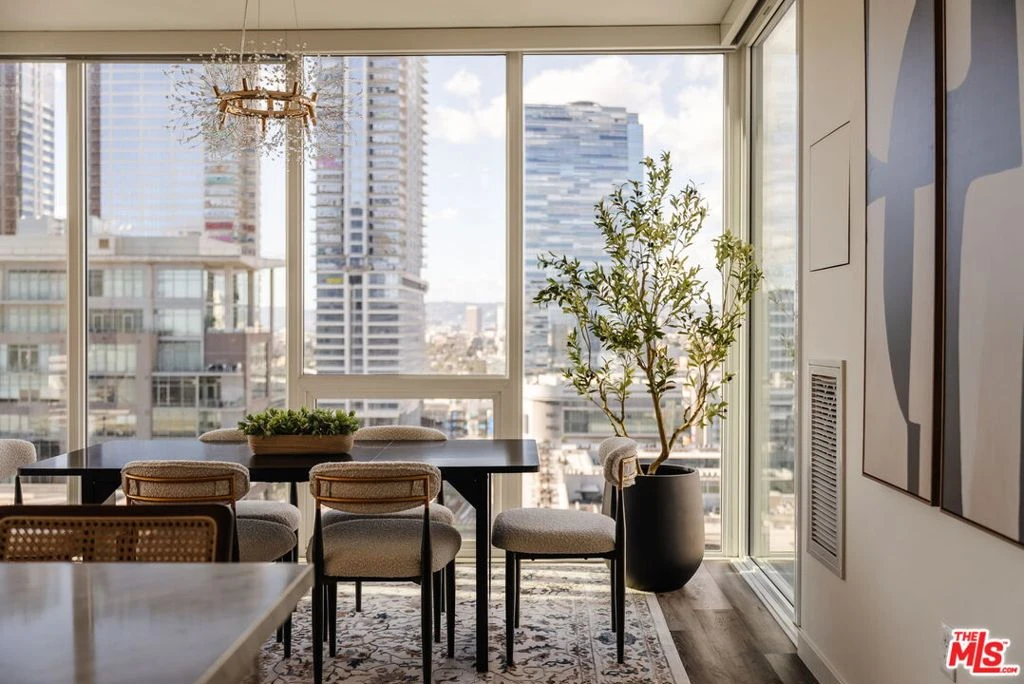 Positioned on the coveted southwest corner of TEN50LA, Residence 1901 sits within the building's most sought-after corner stack, offering sweeping, unobstructed views of the Downtown skyline, the Hollywood Hills, and even the iconic Hollywood Sign. Floor-to-ceiling glass walls place the skyline front and center, filling the home with natural light from morning to sunset. The open-concept layout is designed for both everyday living and easy entertaining, with generous living and dining areas centered around a chef's kitchen featuring Domus & Domus Italian cabinetry, a Bertazzoni cooktop, Liebherr refrigerator, Bosch panelized dishwasher, stainless-steel oven, and a Carrara marble waterfall island. Both the primary and guest bedrooms enjoy impressive city views, enhancing the sense of openness and light throughout the home. The primary suite offers a calm retreat with automated blackout shades, a spacious walk-in closet, and a spa-inspired bath with dual vanities and refined finishes. Privately positioned on the opposite side of the residence, the secondary bedroom provides excellent separation and includes its own full bathroom, making it ideal for guests or a home office. TEN50LA residents enjoy a full range of amenities including 24-hour concierge and security, a resort-style pool and spa, fitness center with Peloton bikes, private theater, business lounge, and resident entertaining spaces. Two dedicated parking spaces complete the offering. Located in the heart of South Park, just moments from LA Live, Crypto.com Arena, and some of Downtown's best dining and entertainment, this residence offers elevated city living in one of DTLA's premier full-service buildings.