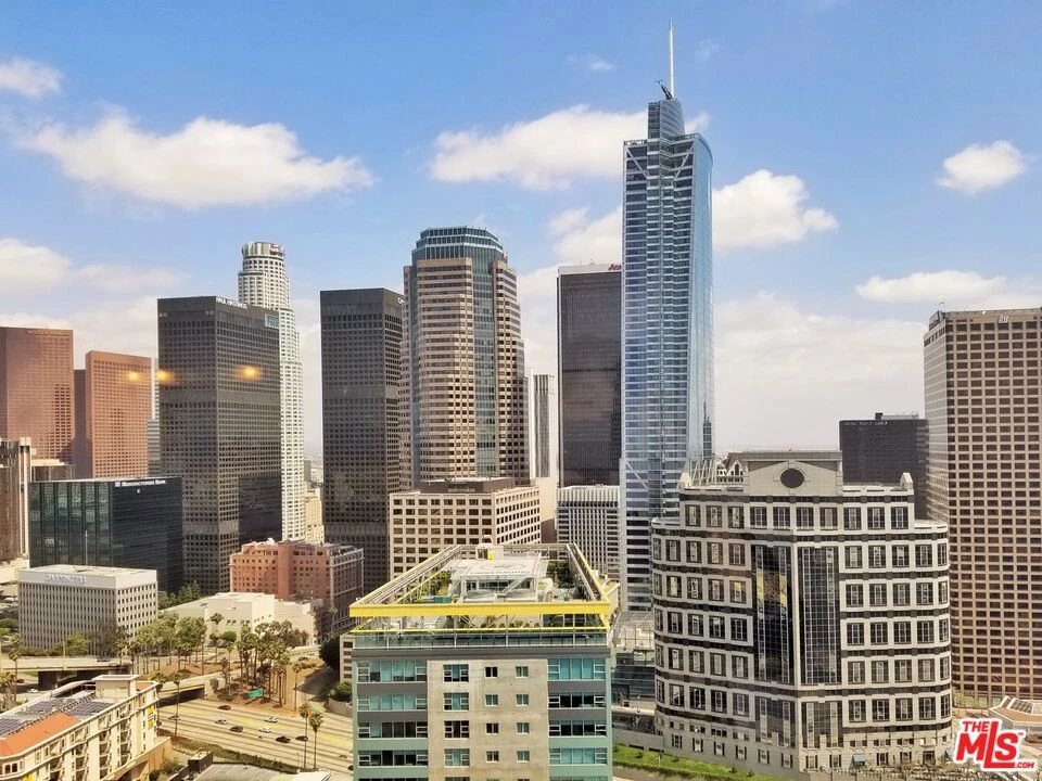 Fantastic east-facing 1 bed 1 bath condo with stunning city skyline views that get even more dramatic at night. Situated at the luxury 1100 Wilshire building with its unique triangular blue glass tower on a podium, this condo features a very rare 5 RESERVED garage parking spaces dedicated to this unit. Massive floor to ceiling windows bring in tons of natural light throughout, and soaring 10'+/-ceilings add to the airy feel. Bamboo flooring, open plan living area and kitchen/dining space. The bedroom/office features a large mirrored closet with a semi-open wall that lets you take advantage of the city views. Bathroom has a step-in shower, linen closet storage, and there is a stacked washer/dryer in the hallway closet. All stainless steel kitchen appliances (fridge, dishwasher, oven/stove, microwave) included, custom privacy window shades, central heat/AC in the unit. This is a truly unique opportunity to have 5 reserved/assigned parking spaces, making it ideal for homeowners with multiple cars or a small business with employees. Top notch amenities include a spacious resort-style sundeck with pool, hot tub, and cabanas, fire pit, mini dog run and spectacular panoramic views of the Hollywood sign, Griffith Observatory, and sunsets. There is also an outdoor fire pit, outdoor dining and kitchen area with BBQ, gym, business room, media room, 24/7 front desk security and reception, and guest parking. Within a few blocks to LA Live, Grammy Museum, The Bloc, Whole Foods, Fig & 7th, Target, LA Athletic Club, Wilshire Grand, Intercontinental Hotel, The Ritz Carlton, The Broad, MOCA, Walt Disney Concert Hall, The Conrad, Grand Central Market, and minutes to Beverly Hills, Culver City, Koreatown, Pasadena, etc.