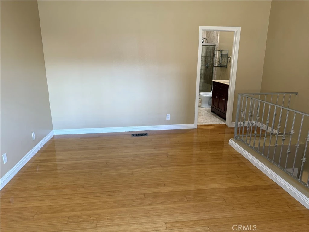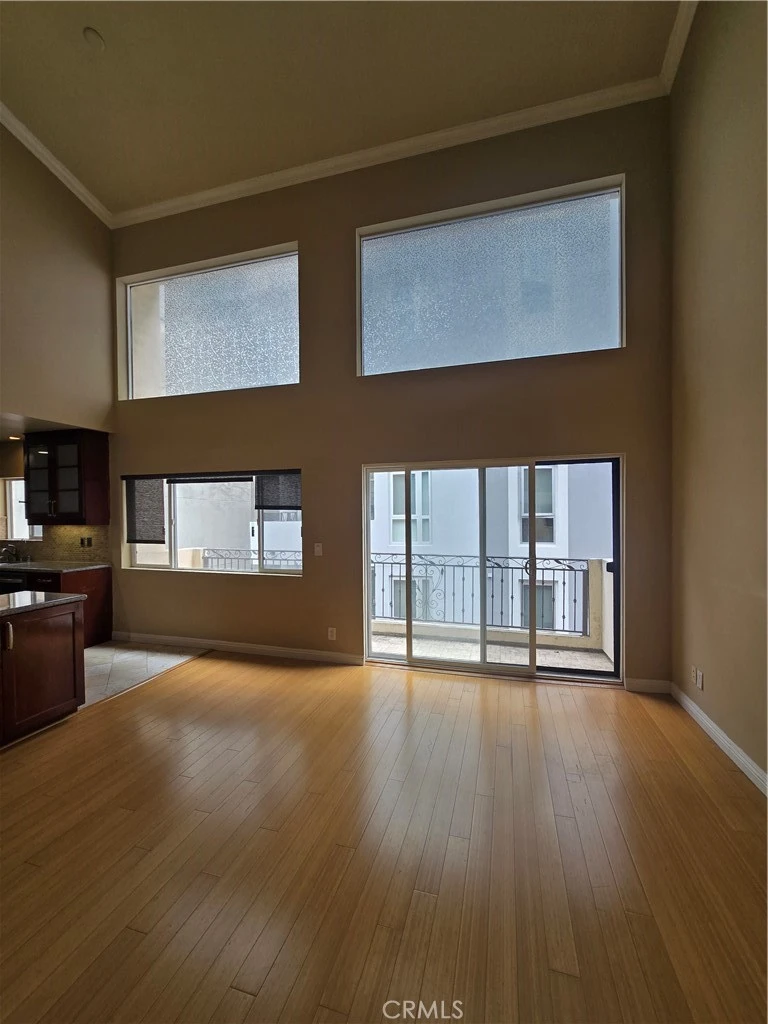 Experience elevated living in this stunning penthouse residence located in the highly desirable Brentwood Villas community. This beautifully designed split-level home features dramatic 25-foot ceilings and an open-concept main level, creating a bright and airy space perfect for both everyday living and entertaining. The main floor includes a well-appointed bedroom, ideal for guests, a home office, or flexible living needs. The spacious living area opens to a private balcony, offering the perfect spot to relax or enjoy morning coffee. The interior showcases elegant bamboo hardwood flooring throughout, complemented by travertine finishes in the kitchen and bathrooms. The gourmet kitchen is equipped with granite countertops, custom tile backsplash, stainless steel appliances, and rich cherry wood cabinetry. Upstairs, the primary suite provides a private retreat complete with a full en-suite bath and a generous walk-in closet. Additional highlights include two gated subterranean parking spaces and a private storage unit. The secure building features intercom entry and video surveillance for added peace of mind. Residents enjoy access to resort-style amenities, including a sparkling pool, fully equipped fitness center, and sauna.