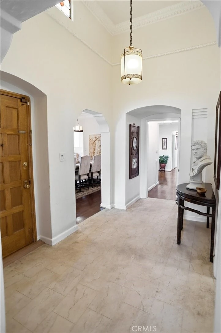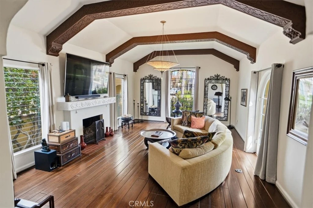 Gorgeous Spanish retreat located in the coveted South Carthay HPOZ. Built in 1934, it includes 3 bedrooms, 2 bathrooms, a den, 2,238 square feet of living space and a 6,885 square foot lot. The hand-crafted artisan gates open to the lushly landscaped brick courtyard and tranquil sounds of its bubbling fountain. The sundrenched living room includes a soaring ceiling with intricately patterned beams, beautifully mantled fireplace, stained glass picture window with street views and French-doors which open to the courtyard. The spacious formal dining room is highlighted by its tall tray ceiling with multiple crown moldings and courtyard views. Adjacent lies the quaint breakfast nook which boasts a built-in hutch. The kitchen exudes the historic charm of the home through its extensive use of period tile and also includes Shaker style cabinets, granite countertops and stainless-steel appliances. The utility room with washer and dryer hook ups is conveniently located off the kitchen. Travel down the main hallway to find original architectural details such as built in storage cabinetry, a built in bookcase with scalloped archways and a stunning stained glass rotunda skylight. The cozy den is a great space to curl up with a good book. The primary suite is generous in size and has 2 closets. The main bathroom is also accessible from the primary suite and boasts period tile, a separate tub, shower and secluded water closet. The first guest bedroom has a Murphy bed, but currently doubles as an office due to its custom built in cabinetry. The second guest bedroom overlooks the backyard and has access to the remodeled full guest bathroom. The backyard has a charming covered patio perfect for al fresco dining and a large grass area for entertaining family and friends. Additional features include hardwood flooring, central air & heat and a double detached garage.