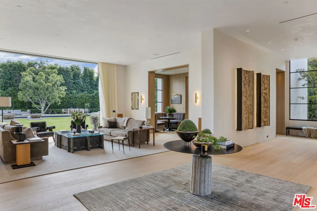 Completely secluded behind tall gates and mature trees on one of the most exclusive streets in Brentwood, an absolutely stunning property masterfully designed by a team of extraordinary designers and craftspeople, sparing no expense. A striking warm contemporary home featuring hand-built steel doors and windows, double framed thick marmorino plaster walls and/or ceiling/walls covered in vertical grain light natural oak. Truly incredible scale, high ceilings and clean lines throughout, a gorgeous living room, paneled library/office/bar, formal dining room, and one the most spectacular kitchen/family room and breakfast rooms in town. There's a separate chef's kitchen, elevator, and full state-of-the-art smart house technology. An ultra-luxurious primary suite with large sitting area and a jaw dropping spa-like bathroom cut from over 50 slabs of imported stone and gorgeous walk-in closets, gallery-esque hallways lead to all en-suite bedrooms with stunning baths and walk-in closets. Full professional Dolby Atmos movie theater, game room/wine tasting and cellar, bar and wellness center with gym, salon, massage, and sauna. Incredible gardens, gravel motor court, large lawns, rare specimen trees, gorgeous swimmer's pool/spa, and wonderful areas for outdoor dining and entertaining. Shown to prequalified clients only.