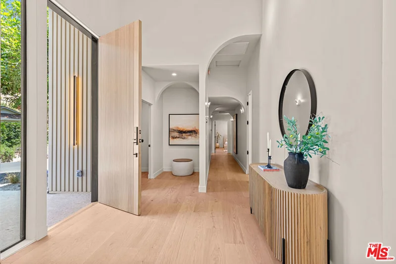 Tucked away on a peaceful street in one of Brentwood's most coveted enclaves, this strikingly updated 4-bedroom, 6-bath modern residence offers refined design, impressive scale, and effortless livability. A dramatic 10-foot entry door opens to a voluminous interior highlighted by soaring 14-foot ceilings and an expansive, open layout ideal for both everyday living and entertaining. The heart of the home features a chef-caliber kitchen equipped with top-tier appliances, an oversized dining area, and multiple living spaces designed for seamless flow. These areas connect effortlessly to a private backyard retreat, complete with a newly constructed pool and spa, along with dedicated spaces for outdoor dining and relaxation.The primary suite serves as a true sanctuary, boasting a spa-inspired bathroom with dual vanities, a freestanding soaking tub, and a custom walk-in closet. Additional amenities include two thoughtfully placed powder rooms, a newly added theater, and a spacious entertainment lounge with a fireplace perfect for hosting gatherings or enjoying quiet evenings at home. Notable upgrades include a fire-resistant standing-seam metal roof, fully updated electrical and plumbing systems, and a generous three-car garage with ample storage. A rare opportunity to own a turnkey modern home in a premier Brentwood location.
