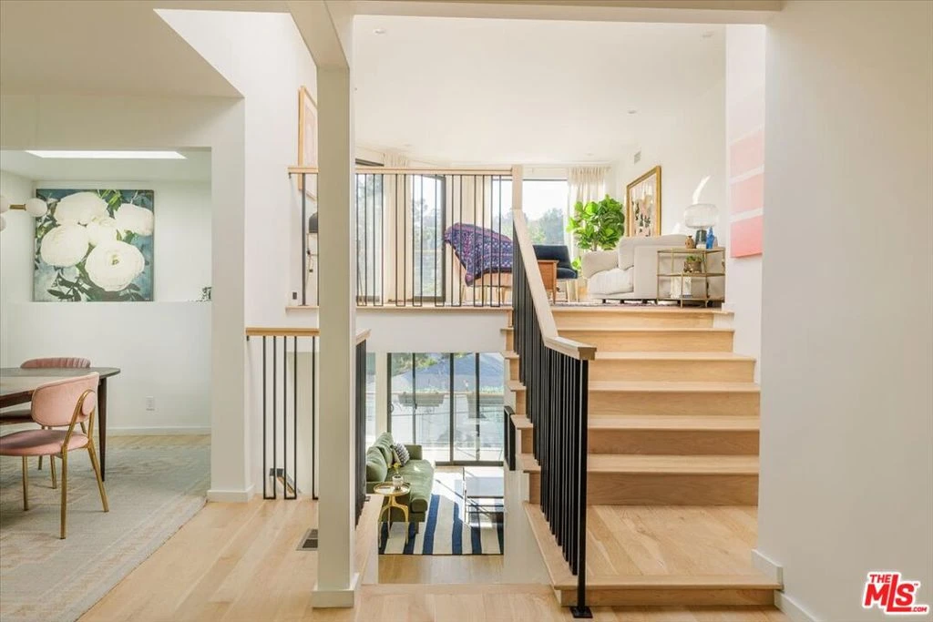 A modernist Silver Lake sanctuary, fully transformed with exquisite design, light, and thoughtful details at every turn. Anchored by a luminous, dome-like central skylight, the home is filled with a warm, inviting glow. The kitchen is a masterpiece of style and function, with professional-grade appliances, abundant storage, and clean, modern finishes. Living and family rooms are captivated by a fireplace, a sleek wet bar, and multiple expansive balconies that frame stunning hillside and neighborhood views. A light-filled powder room is perfectly positioned to serve the main floor. The primary suite is a serene retreat, featuring a spa-inspired bath with a HydroSystem soaking tub, custom Silestone countertop and sink, Magnifica bookmatched porcelain slabs, Kohler fixtures and custom white oak cabinetry. Two gracious lower bedrooms are accompanied by a recently renovated lower-level guest bath, continuing the refined aesthetic with a Silestone countertop + sink and shelving, and Kohler fixtures. There are two hidden private bonus areas beneath the home, each with its own separate entrance and generous storage space ideal for use as a home office, garden tool storage, or even a home gym. Step outside to a beautifully terraced and newly-landscaped private garden, filled with roses, butterfly bushes, olive and plum trees, a lemon tree, and private outdoor spaces, including an expansive deck ideal for entertaining or quiet relaxation. Additional highlights include a direct-access 2-car garage with washer + dryer. Updates include fully paid off solar panels, Tesla EV Charger, new gutter system, foundation retrofit and waterproofing system on the balconies and the roof. Just minutes from the Silver Lake Reservoir, dog park, and the area's best restaurants, cafes and boutiques, this home is a rare modern retreat offering the ultimate in design, comfort, and Los Angeles lifestyle.