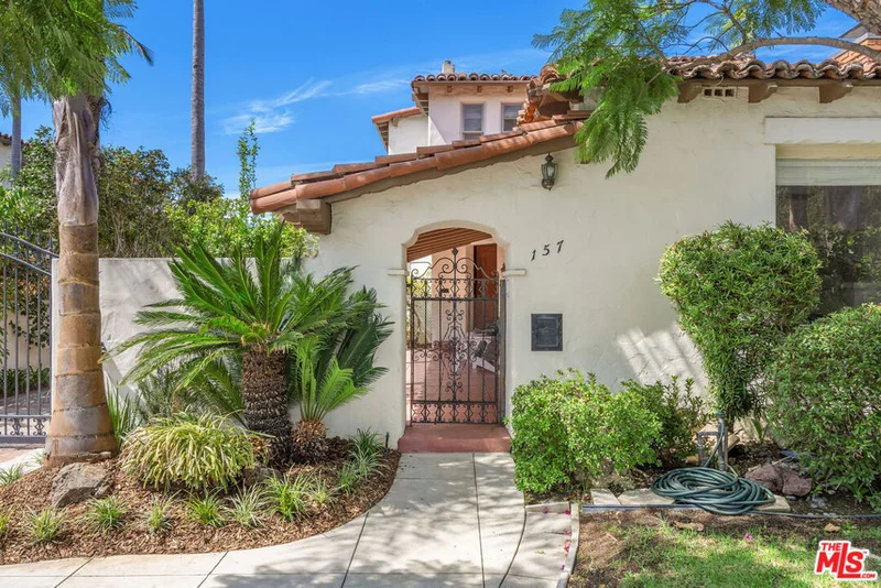 Designed in the 1920s by acclaimed architect H.H. Whitley, this two-story Spanish-style home is a true architectural treasure. Resting on an oversized 8,222 sq ft lot with lush, mature landscaping, the property combines timeless character with thoughtful modern updates. The formal entry showcases original Spanish tile, a graceful curved staircase with exquisite ironwork, and a rare coffin window. To the right, a dramatic living room features soaring beamed ceilings and a grand wood-burning fireplace. On your left, a formal dining room overlooks the rose garden and flows into a renovated kitchen with custom cabinetry, Viking range and hood, Sub-Zero refrigerator, Bosch dishwasher, and a sunny eat-in nook with views of the backyard and pool. Just off the kitchen is a laundry room with half bath, and a cozy den opening to the back patio. A large guest bedroom with en suite bath completes the first floor. Hardwood floors run throughout, accented by Spanish tile in the foyer and laundry and designer tile in the bathrooms. Upstairs, the curved hallway ceiling adds architectural charm. Four spacious bedrooms, including a large primary suite, offer comfort and privacy. The primary retreat features a walk-in closet and a spa-like ensuite with double vanity, soaking tub, and separate standing shower. The expansive backyard is a private oasis with towering hedges, a classic heated kidney-shaped pool, and abundant space for entertaining. The permitted pool house/ADU includes French doors, a full kitchen, bathroom, and its own HVAC system, ideal for guests or rental income. Additional amenities include a long gated automatic driveway with two EV charging stations, automatic sprinkler system, and an updated Nest heating/cooling system throughout the main house. The grounds are enhanced by a stately magnolia tree along with roses, limes, and nectarines. Located moments from The Grove, Pan Pacific Park, The New Beverly, and some of LA's best dining and entertainment, this Whitley-designed residence is a rare offering where history, elegance, and modern convenience meet.