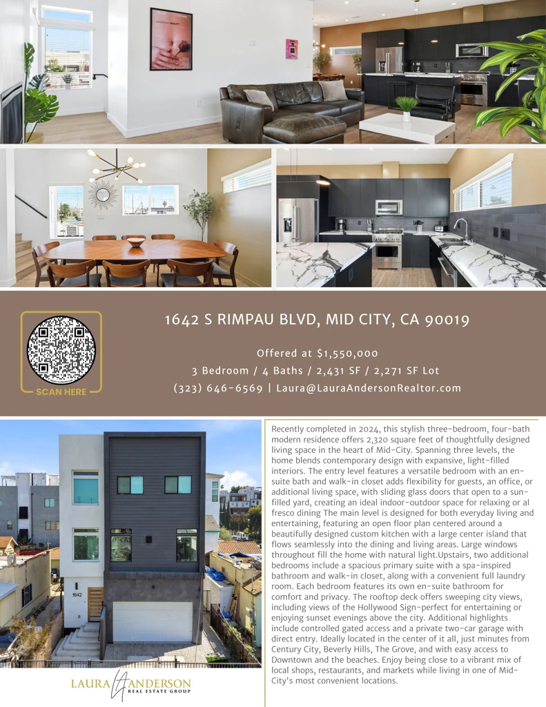 Recently completed in 2024, this stylish three-bedroom, four-bath modern residence offers 2,320 square feet of thoughtfully designed living space in the heart of Mid-City. Spanning three levels, the home blends contemporary design with expansive, light-filled interiors. The entry level features a versatile bedroom with an en-suite bath and walk-in closet adds flexibility for guests, an office, or additional living space, with sliding glass doors that open to a sun-filled yard, creating an ideal indoor-outdoor space for relaxing or al fresco dining The main level is designed for both everyday living and entertaining, featuring an open floor plan centered around a beautifully designed custom kitchen with a large center island that flows seamlessly into the dining and living areas. Large windows throughout fill the home with natural light. Upstairs, two additional bedrooms include a spacious primary suite with a spa-inspired bathroom and walk-in closet, along with a convenient full laundry room. Each bedroom features its own en-suite bathroom for comfort and privacy. The rooftop deck offers sweeping city views, including views of the Hollywood Sign-perfect for entertaining or enjoying sunset evenings above the city. Additional highlights include controlled gated access and a private two-car garage with direct entry. Ideally located in the center of it all, just minutes from Century City, Beverly Hills, The Grove, and with easy access to Downtown and the beaches. Enjoy being close to a vibrant mix of local shops, restaurants, and markets while living in one of Mid-City's most convenient locations.