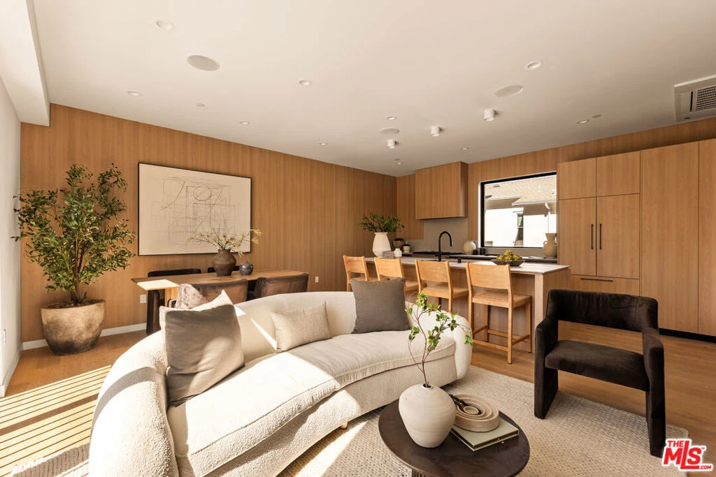 Introducing three newly built townhomes in the vibrant heart of Mid-City - each thoughtfully crafted with a refined design sensibility and an eye for modern luxury. Every residence showcases bespoke finishes and architectural details, including custom lighting, wood-paneled accent walls, and Roman clay plaster accents that provide warmth and sophistication throughout. Unit B boasts a private entry foyer with soaring ceilings, leading directly to a lower-level en-suite guest bedroom - ideal for a home office or gym space. The main level is designed for everyday comfort and entertaining, featuring a cozy living area with sliding glass doors, a chef's kitchen with stainless steel appliances, an oversized island with breakfast bar, and a dining area framed by sliding glass doors. Upstairs, the primary suite serves as a tranquil retreat, complete with a spa-inspired ensuite bathroom featuring dual vanities, a stunning walk-in shower, and a custom-built walk-in wardrobe. Two additional guest bedrooms and a full shared bath provide ample space for family or guests. The top-level boasts an incredibly spacious flex space perfect for a media lounge, game room, or private home office, with the added convenience of a guest bath and built-in storage. Sliding doors lead to an expansive, covered rooftop terrace, offering sweeping panoramic views of the Hollywood Hills and beyond - an unbeatable backdrop for entertaining or relaxing. These residences embody elevated Mid City living - where thoughtful design, high-end finishes, and breathtaking views come together seamlessly.
