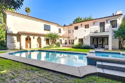 Villa de Estrella — A Private Spanish Oasis in Prestigious Outpost Estates. Hidden behind gates on a rare corner lot, Villa de Estrella offers an extraordinary sense of privacy in one of the most prestigious enclaves of the Hollywood Hills. Mature trees and lush, layered landscaping surround the home on all sides, creating a peaceful oasis that feels worlds away—yet sits moments from Runyon Canyon, studios, and the Sunset Strip. A grand foyer opens into sun-filled living spaces framed by soaring ceilings, graceful archways, and multiple sets of French doors that invite natural light and connect seamlessly to the outdoors. The formal living and dining rooms flow effortlessly into a spacious chef’s kitchen and adjoining family room, offering an ideal environment for both everyday living and elegant entertaining. A versatile en-suite bedroom with its own entrance serves perfectly as an office, guest suite, or creative studio. Upstairs, generously scaled guest rooms accompany a serene primary retreat with vaulted ceilings, expansive closet space, and a spa-inspired bath. The backyard is the home’s crown jewel—a true resort-style sanctuary with a large pool, spa, fire pit lounge, and full outdoor wet bar, all wrapped in lush greenery that ensures exceptional seclusion rarely found in this central Hollywood location. Combining timeless Spanish character with the livability and volume of a modern estate, this gated residence offers the best of both worlds: the tranquility of a private retreat and the convenience of a premier Hollywood address.