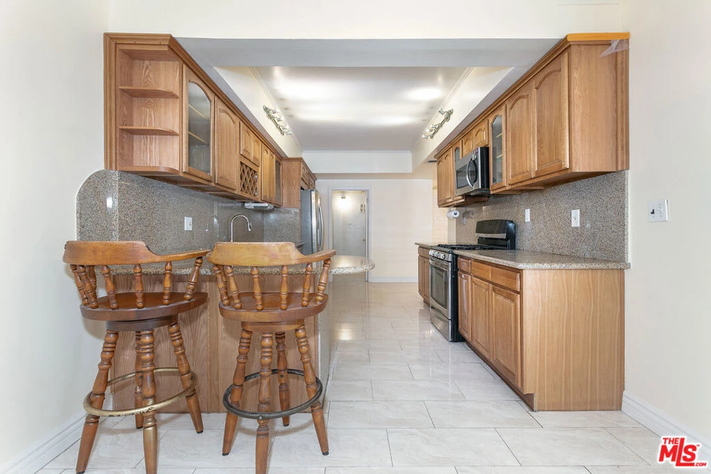 Remodeled and move-in ready single level condo with large patio. Enter through a formal entryway and step-down into an oversized living room with a gorgeous fireplace and wet bar. The large windows and doors flood the room with light and lead you to a massive private patio perfect for entertaining and al-fresco dining. Back inside, the updated kitchen with breakfast bar offers stainless steel appliances, a large dining area, and a full laundry room. Down the hall you'll find the expansive primary suite with abundant closet space and an updated primary bath with double vanity plus tub & shower. The secondary guest bedroom offers a wall of closets with an adjacent remodeled bathroom. The unit is located on the back side of the building so it is very quiet and serene. Includes two parking spaces tandem. Located near UCLA, Westfield Century City, Fox Studios, and a short drive to the 405.