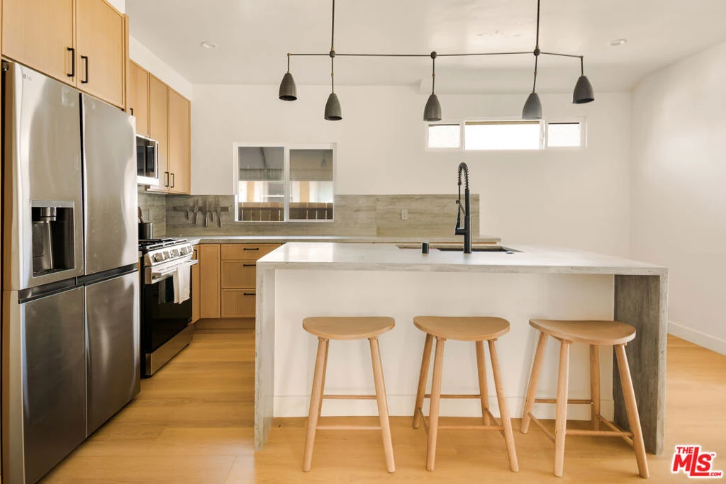 Located in West Adams, this turnkey modern contemporary completely reimagined home is a rare offering. Thoughtfully redesigned with a focus on timeless design and functionality, the residence blends clean architectural lines with warm, natural materials to create an inviting and elevated living experience. Inside, vaulted ceilings, wide-plank oak flooring, and abundant natural light define the open-concept living spaces, delivering an airy and seamless flow throughout. The custom kitchen is both refined and highly functional, featuring white oak cabinetry, a silver travertine waterfall island, stainless steel appliances, and curated designer lighting, ideal for everyday living and effortless entertaining. Living and dining areas connect fluidly to a private outdoor patio, embracing true indoor outdoor California living. The spacious primary suite offers a private sanctuary with a spa-inspired bath highlighted by microcement finishes and refined detailing. Two additional bedrooms and beautifully appointed bathrooms provide flexibility for guests, family, or a home office. Additional amenities include central HVAC, in-unit laundry, and fully updated systems throughout. A compelling opportunity offering exceptional value, a functional layout, and a completely move-in ready experience in one of Los Angeles' most dynamic neighborhoods. Ideally located just minutes from Culver City's leading tech hubs, West Hollywood, and the vibrant dining and cultural scene of DTLA, placing the best of the city within easy reach.