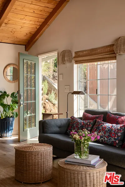 Cruise past the legendary Canyon Country Store, Laurel Canyon Cafe, and Pace Italian restaurant, then turn onto historical "Love Street" (Rothdell Trail) immortalized in the song by The Doors' lead singer, Jim Morrison, who once lived there with his girlfriend Pamela Courson. Just a few houses over, accessed by Prospect Trail--a City-owned stair street--you'll discover a special piece of Laurel Canyon history. Believed to have been built as a hunting lodge in 1928, this chill retreat has been thoughtfully updated while preserving its soulful character. It once again proudly presides over an enclave long favored by artists and creatives. This home channels classic Craftsman bungalow charm inside and out. The bright and airy interior includes tongue-and-groove wood vaulted ceilings that carry through to the bedroom and bathroom, pet-proof LVP-wood floors, and crafted details throughout. Large picture windows frame serene canyon and treetop views, bringing nature indoors and providing an expansive feel to the space. The nearly 600-square-foot layout includes one bedroom with walk-in closet, one bathroom, and a charming yet highly functional kitchen. French doors off the bedroom open to a private, shady patio and grassy yard with low-maintenance California native plantings and irrigation. Additional storage and laundry are conveniently located in the build-out below. Updates include a new roof. Perfect as a condo alternative, creative retreat, or inspiring pied-a-terre this rare Laurel Canyon hideaway invites you to slow down and let your imagination wander.