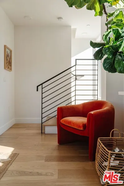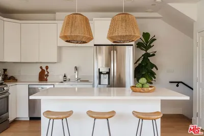Built in 2019, where Echo Park and Silver Lake converge, this contemporary 2-bedroom, 2.5-bathroom small lot single-family home spans 1,560 square feet across three levels and is topped with a private rooftop deck showcasing city views. With clean architectural lines, abundant natural light, and leased solar for added efficiency, the residence offers easy living in one of LA's most dynamic neighborhoods. A private and gated front entry leads to the ground-level foyer, complete with a powder room and direct access to the attached two-car garage, outfitted with MyQ smart garage opener and offering additional storage. Upstairs, the main living level is bright and airy, highlighted by expansive windows and warm hardwood flooring throughout. The living room transitions seamlessly into the dining area, which opens to a wraparound balcony framed by lush greenery, creating an easy indoor-outdoor flow. The kitchen is thoughtfully designed with stainless steel appliances, quartz countertops, and ample cabinetry, balancing style and functionality. A conveniently located laundry closet sits just off the kitchen on this level. Above the living spaces, on the third level, are two private bedroom suites. The primary suite includes ample closet space and an ensuite bathroom with dual sinks, a glass-enclosed shower, a separate soaking tub, and contemporary finishes. The second bedroom is well-sized and versatile, perfect for guests, a home office, or a creative space with its own hallway bath. At the top level, a private rooftop deck captures sweeping hillside views and offers a hedged open-air setting ideal for relaxing or entertaining beneath the California sky, complete with a dedicated BBQ hookup. Thoughtful upgrades, including a tankless water heater, Nest thermostat and ADT Home Security System, enhance the home's overall comfort and efficiency. Located just moments from neighborhood favorites like Botanica, Canyon Coffee, Lady Byrd Cafe, and L & E Oyster Bar, and close to the trails of Elysian Park and the shops and restaurants along Sunset, this Echo Park home delivers modern comfort with unbeatable access to the best of the Eastside.