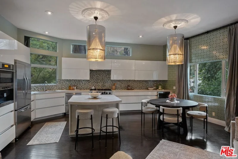 Dubbed by Elle Decor as "The Swankiest House in Hollywood," this iconic Laurel Canyon residence continues to captivate with its bold design and effortless glamour. Originally built in 1978 by acclaimed architect Gary Gilbar and later elevated by celebrity design duo Woodson & Rummerfield, the home is a true modern showpiece. Offering 3 bedrooms, 2 bathrooms, and 1,978 square feet, the interiors blend high style with warm livability. The expansive living and dining rooms showcase soaring ceilings, a striking fireplace, statement wall coverings, and dramatic walls of glass that open seamlessly to an entertainer's deck.The terraced grounds create a private oasis with a dramatic 9-foot waterfall, raised vegetable beds, and ambient Malibu lighting for unforgettable evenings under the stars. The chef's kitchen pairs sleek design with premium appliances, including a Viking range with warming drawer, Fisher & Paykel dual dishwasher, Miele built-in coffee system, and custom bi-fold cabinetry.A chic guest bedroom and designer bath complete the main level. Upstairs, the primary suite features treetop views, vaulted ceilings, a fireplace, lounge area, custom walk-in closet, and a beautifully remodeled bath with dual vanities and refined finishes. The third bedroom is equally distinctive with bespoke built-ins and curated design details throughout.
