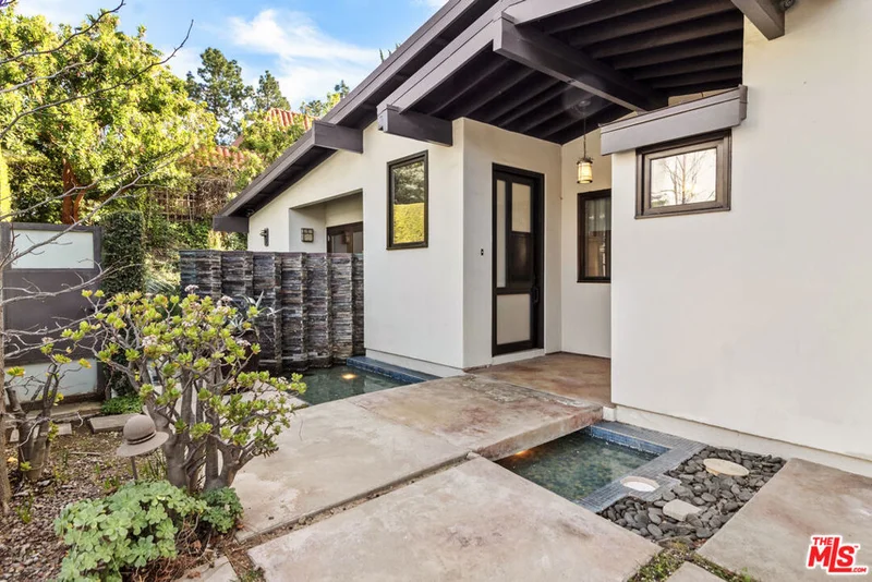 This updated California Contemporary blends clean architectural lines with seamless indoor-outdoor living, set on nearly an acre of serene Brentwood hillside just minutes from Sunset Boulevard. Offering exceptional privacy and sweeping canyon views, this 4-bedroom, 3.5-bath residence is designed for refined living and effortless entertaining. A thoughtfully designed open floor plan is complemented by a state-of-the-art automation system allowing control of lighting, climate, and security at your fingertips, along with whole-home water filtration and an advanced ventilation system. Italian terrazzo tile and bamboo flooring add warmth and architectural character throughout. The living room features soaring ceilings, a cozy fireplace, and walls of glass that frame breathtaking views of the infinity-edge pool, fire pit, and surrounding canyons. The kitchen flows seamlessly into the dining area and living room, both opening to the expansive backyard retreat. Outdoors, a spectacular infinity pool is perfectly positioned to capture the views, accompanied by a fire pit for intimate evenings under the stars, and a barbecue area with a lounge / dining area. Multiple entertaining areas create a true resort-style setting, ideal for gatherings or quiet relaxation. The primary suite is thoughtfully situated beside the tranquil entry pond and fountain, offering a peaceful, spa-like retreat and a true sense of serenity. Additional features include a 2-car covered garage with direct access and beautifully landscaped grounds that enhance the home's quiet, private setting. A rare Brentwood offering combining privacy, views, technology, and timeless California design in an exceptional location just a block away from the popular hiking trail at Westridge-Canyonback Wilderness Park.
