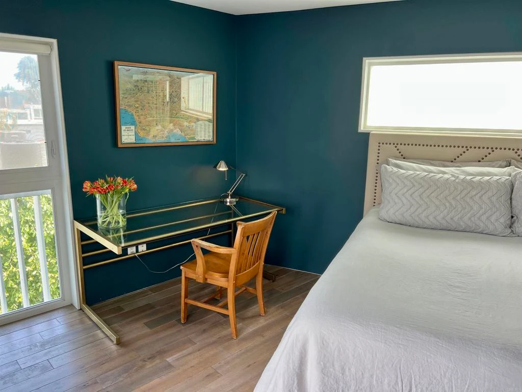 One of only six modern single-family homes built in 2012, this architecturally distinctive residence is LEED Platinum certified and recipient of the 2014 AIA Merit Award. Set within a private gated courtyard, the home's striking exterior vertical fins ensure privacy while allowing ample natural light and views from every angle inside. An open, easy-flowing split-level floor plan features hardwood floors throughout, two large storage closets, a spacious chef’s kitchen with Bosch appliances, walk-in pantry, custom cabinetry, and Caesarstone countertops. The dining room opens to a balcony, perfect for seamless indoor-outdoor living. Upstairs, the generous primary suite includes a large walk-in closet and direct access to a private roof deck with sweeping 360-degree views stretching to the Griffith Observatory, accompanied by a secondary bedroom suite and convenient stacked laundry closet. Just minutes from the reservoir, LA River path, and an array of restaurants and shops — an unbeatable Silver Lake location.