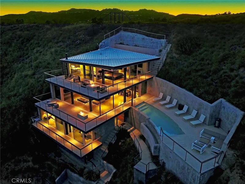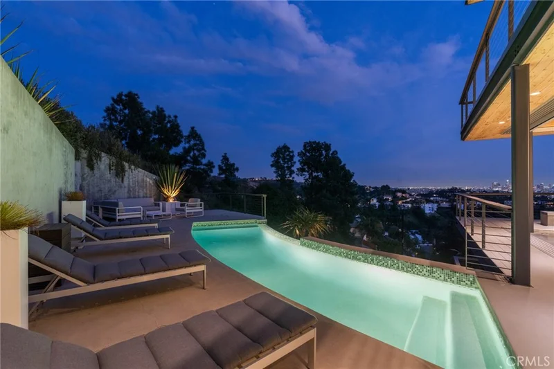 2917 Durand Drive | Hollywood Hills Perched at the pinnacle of Beachwood Canyon, this architecturally striking steel-constructed residence (2,405 sq ft on a 9,119 sq ft ridgeline lot) offers a rare convergence of unobstructed panoramic views, total privacy, and turnkey luxury living. Commanding sweeping vistas encompassing the Hollywood Sign, Griffith Observatory, Downtown Los Angeles, Lake Hollywood and the city skyline beyond, the home is uniquely positioned along a ridgeline with no immediate neighbors, creating a level of seclusion rarely found in the Hollywood Hills. Designed for architectural integrity and effortless indoor–outdoor living, the residence features expansive walls of glass, soaring ceilings, polished concrete floors warmed by near-silent radiant heating throughout, and a dedicated gym/office space on the lower level—with every level offering sweeping views from gym to master bedroom. An elevator provides convenient access between select levels, complementing the home's thoughtful engineering and modern livability. On the main living level and within the primary suite, floor-to-ceiling glass doors retract seamlessly from the corner, dissolving the boundary between interior and exterior and allowing the home to fully open to the surrounding skyline. An infinity-edge pool on the main level steps away from the living room appears to merge directly with the city beyond, anchoring an entertainer's setting that feels suspended above Los Angeles. Refined modern comforts include a gas fireplace, instant hot water in the kitchen, a glass-enclosed shower with direct city views, and a spa-like primary suite featuring a steam shower and Japanese soaking tub—creating a private retreat framed by dramatic city views. The interiors are offered fully furnished with high-end, designer-curated pieces, presenting a truly turnkey opportunity for the most discerning buyer. Each space has been thoughtfully composed to complement the home's modern materials, clean lines, and dramatic setting. With three bedrooms and 2.5 baths (3 full equivalent), the layout balances openness with intimacy, functioning equally well as a primary residence, a sophisticated retreat, or a statement architectural acquisition. This is not a conventional hillside home. It is a rare view-driven residence, defined by privacy, design, and permanence—offered as a complete, ready-to-live experience. Private tours available by appointment.