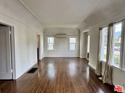 Charming Spanish bungalow in the heart of Atwater Village, blending timeless character with comfortable, functional living. The spacious living room showcases a classic coved ceiling, hardwood floors, and abundant natural light, creating a warm and inviting atmosphere. Both bedrooms are positioned toward the rear of the home for added privacy, with one offering direct access to a covered patio and a fully fenced backyard. The outdoor space provides a peaceful retreat with room for entertaining, gardening, and enjoying a mature lemon tree. A detached two-car garage offers excellent flexibility for a potential home office, creative studio, or additional storage. The home includes a dishwasher, refrigerator, and range, along with laundry hookups in a dedicated laundry room just off the kitchen. Each room features its own energy-efficient mini-split system, providing individualized heating and cooling for year-round comfort.