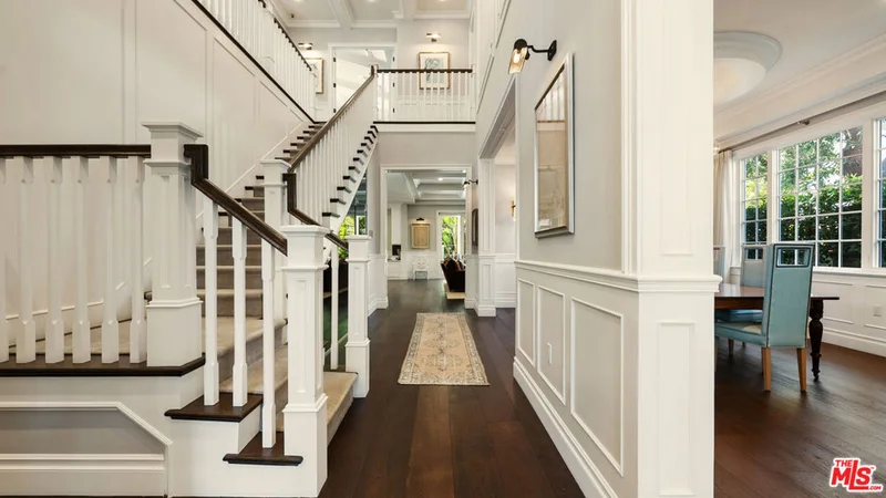 Located on one of Brentwood's most desirable streets this custom East Coast inspired traditional residence is defined by timeless architecture and exceptional craftsmanship. Crown moldings, wainscoting, designer lighting, and meticulously selected finishes create a refined, tasteful, aesthetic throughout. Privately gated and positioned on a corner lot, the property is framed by manicured hedges, roses, and lush landscaping that enhance both privacy and curb appeal. A grand foyer welcomes you into the home, where the formal living and dining rooms sit to the right. The living room, anchored by a fireplace, opens to the private front porch and front yard through French doors, while the formal dining room features detailed moldings, designer chandelier, and a view of the expansive wine cellar beneath the staircase. At the center of the home, the kitchen and family room provide the ideal setting for everyday living and entertaining, with a fireplace, coffered ceilings, and accordion doors that open to the backyard for seamless indoor outdoor living. The chef's kitchen features an oversized island, marble countertops, custom cabinetry, top of the line stainless steel appliances, and a breakfast nook with French doors leading outside. A powder room and a guest bedroom with en suite bathroom currently used as an office complete the main level. Upstairs, the primary suite offers a private retreat with vaulted ceilings, fireplace, walk in closet, beverage bar, private balcony, and a spa like bathroom with dual vanities, soaking tub, and oversized frameless glass shower. Three additional bedrooms and two full bathrooms complete the upper level, including two bedrooms that share a Jack and Jill bathroom. The backyard is designed for effortless entertaining with an outdoor kitchen and grill, multiple seating areas, fire feature, and a pool and spa framed by tall palms. Ideally located just moments from the Brentwood Country Mart, award winning schools, and the best shopping and dining the Westside has to offer.